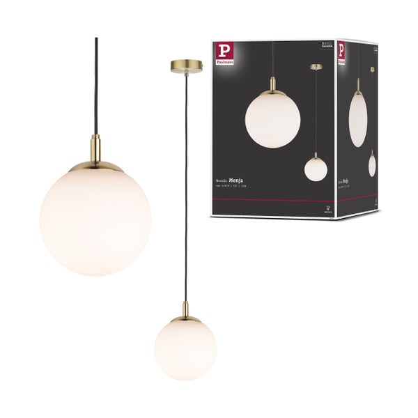 Trendiger Materialmix aus satiniertem Glas und gebürstetem Messing: die Pendelleuchte Menja steht für wohnliches Licht im Jungle Look. Setzen Sie spielend leicht Lichtakzente in allen Räumen. Durch Kombination mit anderen Serien schaffen Sie ein individuelles Wohnambiente. Je nach verwendetem Leuchtmittel, ist die Lampe dimmbar.