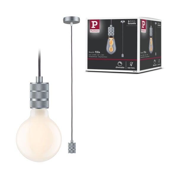 Mit ihrer modischen, grauen Farbe schafft die Pendelleuchte Tilla, im Metall-Look, fantastische Lichtakzente an jeder Zimmerdecke. Die Leuchte sorgt in Kombination mit herkömmlichen E27 Leuchtmitteln für einen modernen Hingucker in jedem Wohnraum, ob über dem Sideboard, über dem Nachtschrank oder mitten im Raum. Das Pendel, mit einem robusten, 2 m langen Textilkabel, fügt sich ideal in jeden Wohnraum ein und schafft eine angenehme Lichtstimmung. Je nach verwendetem Leuchtmittel, ist die Lampe dimmbar.