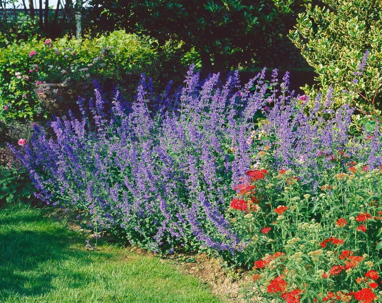 Nepeta x faassenii ‘Six Hills Giant’, die bewährte Katzenminze, ist eine aromatische Staude mit graugrünem, leicht filzigem Laub und unzähligen lavendel- bis blauvioletten Blütenähren, die von späten Frühling bis in den frühen Herbst erscheinen. Die Sorte überzeugt durch einen buschigen, locker überhängenden Wuchs und bildet dichte, horstige Polster, die je nach Standort etwa 60 bis 80 cm hoch und ähnlich breit werden. Das Laub verströmt bei Berührung einen angenehmen Duft, treibt im Frühjahr kräftig aus und zieht im Winter meist ein, in milden Lagen bleibt es teilweise wintergrün. Als robuste Beetstaude ist ‘Six Hills Giant’ eine hervorragende Wahl für sonnige Staudenbeete, Vorgärten und Steingärten, ebenso als Begleitpflanze zu Rosen, in Gruppenpflanzungen oder als flächiger Rand- und Einfassungsstreifen entlang von Wegen. Auch in größeren Kübeln auf Terrasse und Balkon macht dieser Blütenstrauch im Staudenformat eine gute Figur, wo sein lockerer, natürlicher Habitus mediterranes Flair erzeugt. Bevorzugt werden warme, vollsonnige Standorte mit gut durchlässigem, eher trockenem bis frisch-humosem Boden; Staunässe sollte vermieden werden, Kalkverträglichkeit ist gegeben. Ein Rückschnitt nach der ersten Hauptblüte regt eine zügige Nachblüte und einen kompakten Aufbau an, im zeitigen Frühjahr erfolgt der bodennahe Formschnitt. Geringer Nährstoffbedarf und hohe Hitzetoleranz machen diese Gartenstaude zu einer pflegeleichten, vielseitigen Zierpflanze für den naturnahen, modernen wie klassischen Garten, als Solitärakzent oder in harmonischer Gruppenpflanzung mit Salvia, Stachys und Ziergräsern.