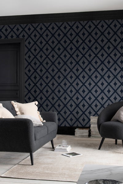 Verleihen Sie Ihren Wänden Luxus und Glamour mit Deco Triangle Navy. Dieses glamouröse Tapetendesign zeigt ein geometrisches Maxidreieck in einem atemberaubenden Silbermetallic vor einem Hintergrund in tiefem Marineblau. Gedruckt auf mattem Papier, hat dieses atemberaubende Design eine luxuriöse Oberfläche.