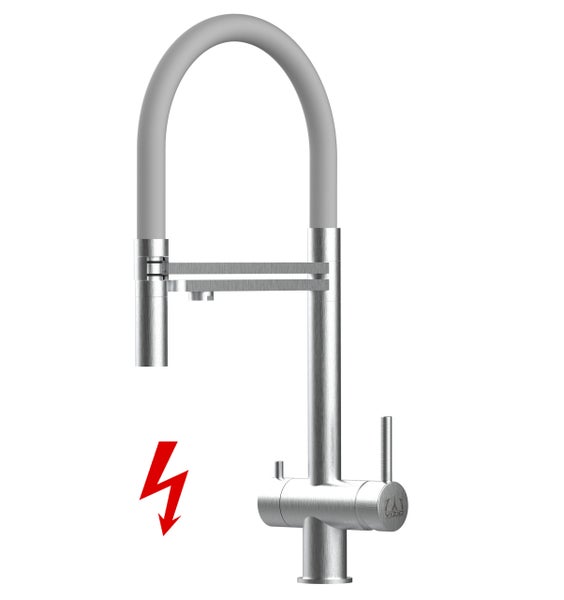 NIEDERDRUCK 3 Wege Wasserhahn Küchenarmatur Spültischmischer, Edelstahl Massiv aus Chirurgiestahl, mit 360° schwenkbarem Auslauf und abnehmbare 2 strahl Handbrause - Komplett mit Durchflussreduzierer auf 7liter pro min. um Ihren Niederdruck Boiler vor Beschädigungen zu schützen! - für Kalt-,Warm- und Filterwasser mit separatem Ventil am Hahn und separatem Kanal für gefilterte Wasserentnahme