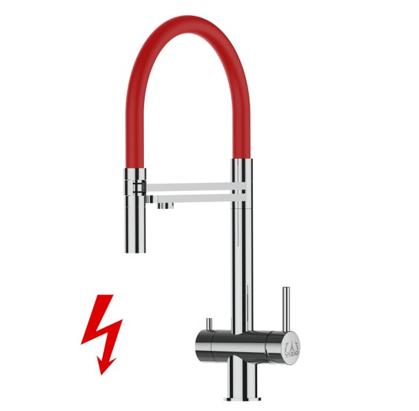 NIEDERDRUCK 3 Wege Wasserhahn Küchenarmatur, Edelstahl Massiv mit 360° schwenkbarem Auslauf, abnehmbare 2 strahl Handbrause, Hochglanz / Rot