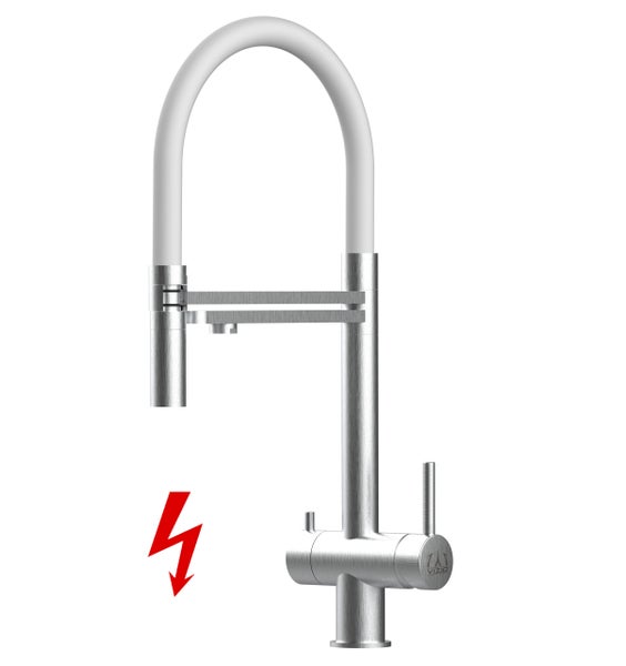 NIEDERDRUCK 3 Wege Wasserhahn Küchenarmatur Spültischmischer, Edelstahl Massiv aus Chirurgiestahl, mit 360° schwenkbarem Auslauf und abnehmbare 2 strahl Handbrause - Komplett mit Durchflussreduzierer auf 7liter pro min. um Ihren Niederdruck Boiler vor Beschädigungen zu schützen! - für Kalt-,Warm- und Filterwasser mit separatem Ventil am Hahn und separatem Kanal für gefilterte Wasserentnahme