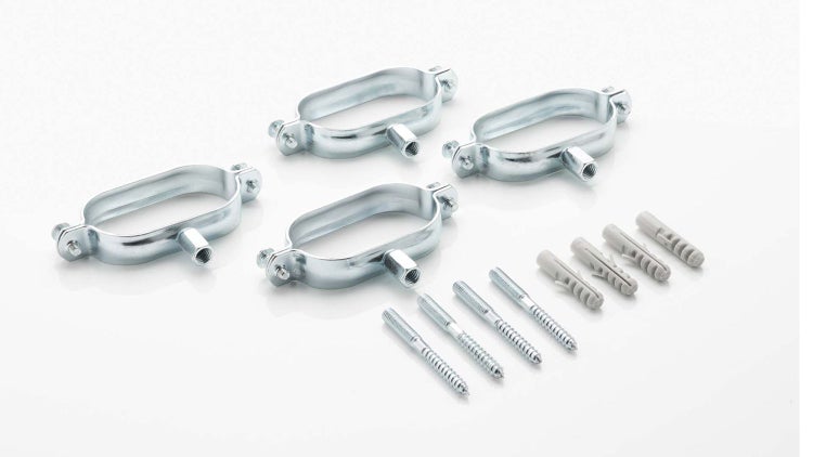 - Einfache Installation durch mitgeliefertes Montagematerial bestehend aus vier Ovalschellen, Stockschrauben M8x80 und Dübel S10