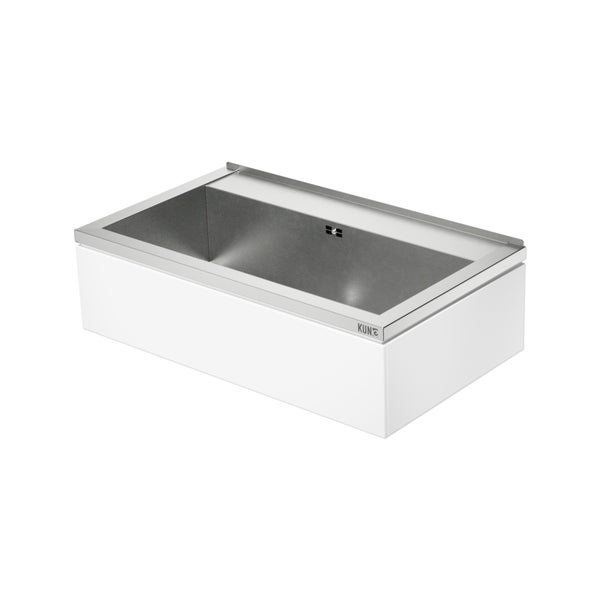 KUNe NOVUM 80 weiß ist Ihr eleganter Arbeitshelfer mit noch mehr Fassungsvermögen in der Farbe RAL 9010 reinweiß. Nobel, funktional und schlicht so präsentiert sich unser Edelstahl Ausgussbecken der Serie NOVUM mit aufsteckbarer Blende aus pulverbeschichtetem Chromnickelstahl. Der Pulverlack lässt die Blende sandgestrahlt wirken und verleiht dem Ausgussbecken einen besonders modernen und frischen Touch. Die moderne Beschichtung macht das Waschbecken zu einem echten Hingucker. Ob im Hauswirtschaftsraum, im Keller oder in der Waschküche, mit Novum sind Sie auf der stilsicheren Seite.