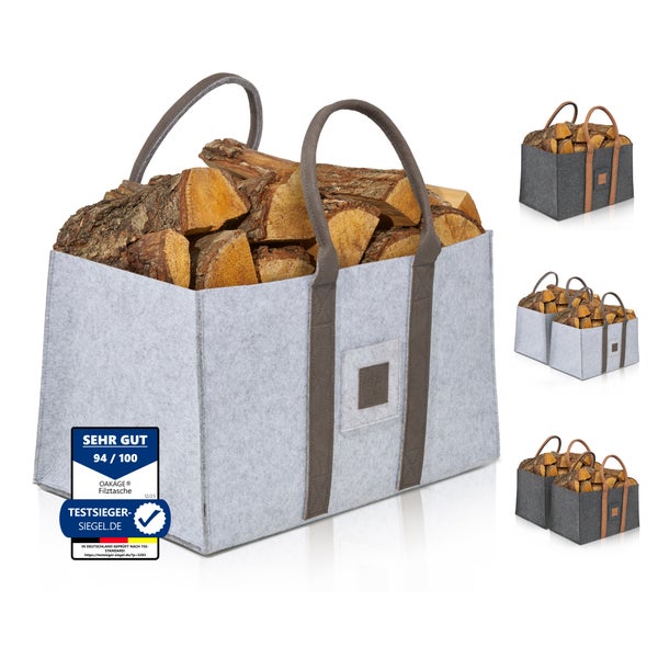 Der OAKAGE Kaminholzkorb… Der erste Holzkorb, der auch zum Tragen von Kaminholz gedacht ist! Hätten Sie nicht auch gerne einen stylischen Ersatz für Ihre Holzeimer und würden gerne für Ihr ordentliches Wohnzimmer und die Kaminlandschaft angesprochen werden? Dann werden Sie lieben, wie sich unser moderner Brennholzkorb nahtlos in jedes Wohnambiente einfügt und zum stilvollen Blickfang wird, der gleichzeitig Umweltbewusstsein und Funktionalität vereint. Was wir Ihnen nicht versprechen dürfen, ist dass der voll gefüllte, große Korb aus Leder, Weide oder Filz genügend Holzscheite für den ganzen Tag fassen kann und Sie sich somit den kalten Weg zum Holzlager sparen, niemand kann das. Aber wir können Sie auf tausende unserer zufriedener Kunden verweisen, die uns berichten, dass Sie dank unserem Feuerholzkorb deutlich weniger Feuerholz holen müssen und dadurch mehr magische Momente mit Ihren Liebsten vor dem Kamin verbringen können. Und dank dem patentierten, ergonomischen Tragesystem durch die abstehenden, ausreißsicheren Holzgriffen fällt selbst ein langer Weg zurück ins Warme mit einem prall gefüllten Tragekorb kinderleicht. Egal ob beim Einkaufen, beim Holz holen oder innen vor dem Kamin, mit OAKAGE haben Sie immer den richtigen Begleiter zur Holzaufbewahrung an Ihrer Seite. Dazu kommt noch, dass Sie mit jedem Kauf etwas Gutes für die Umwelt tun und das bequem vom Sofa, denn mit einem Teil des Umsatzes forsten abgeholzte Regionen in Deutschland wieder auf. Jetzt bestellen und das Knistern in und vor Ihrem Kamin wieder erleben.