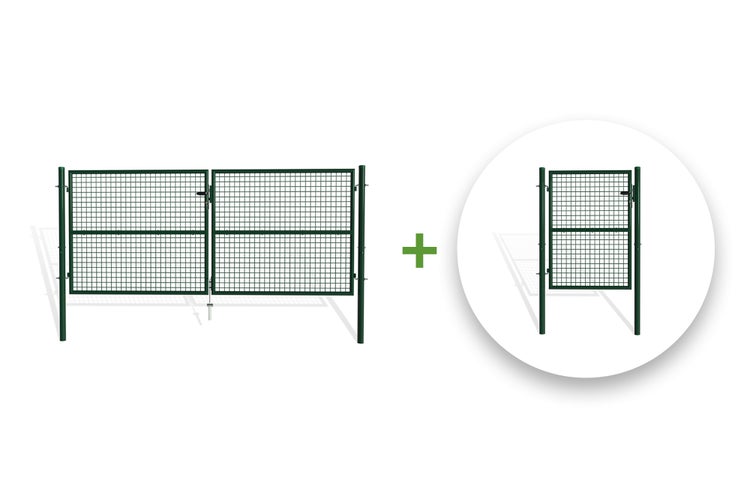 OLGA Pack Breite 306 x Höhe 131 cm Mesh-Schwingtor + 1 m GRÜNES Tor, inkl. Griff, Schloss und Schlüssel I Gartenpforte Einfahrtstor Hoftür