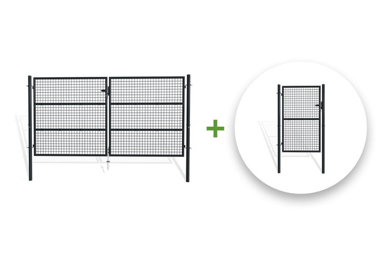 OLGA Pack Breite 306 x Höhe 156 cm Mesh-Schwingtor + 1 m GRAUES Tor, inkl. Griff, Schloss und Schlüssel I Gartenpforte Einfahrtstor Hoftür
