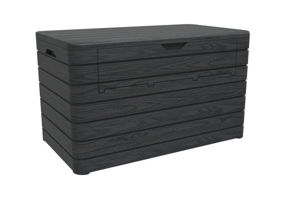 Die Terrasse bietet sich besonders an warmen Tagen als idealer Erholungsort für Sie und Ihre Familie an. Um für alle ausreichend Platz zu schaffen, kommen meist bequeme Lounge- oder Gartenmöbel zum Einsatz. Das komfortable Sitzvergnügen wird durch dick gepolsterte Sitzkissen maximal gesteigert. Damit die Kissen weder entwendet noch bei einem Sommergewitter durchnässt werden, ist es nötig, sie am Abend sicher zu verstauen. Für die gewünschte Ordnung auf Ihrer Terrasse und in Ihrem Garten bieten wir Ihnen die Kissenbox , welche neben Ihrer ansprechenden Optik zusätzlich ausreichend Platz bietet, um selbst 60 x 60 cm große Loungekissen zu verstauen. Unsere Auflagenbox wird durch viele Vorteile einzigartig. Neben dem riesigen Volumen von 970 Liter, welches sich aus den Maßen von ca. 146 x 82 x 85 (H) cm ergibt, bringt die Aufbewahrungsbox durch ihr hochwertiges Kunststoff-Material die besten Voraussetzungen für alle Anforderungen im Außenbereich mit sich. Die Gartenbox ist sowohl Spritzwasser geschützt als auch UV-beständig. Dank dem UV-Schutz bleibt Ihnen die moderne anthrazitfarbene Holzoptik lange Zeit erhalten. Die detailtreue Holznachbildung überzeugt selbst beim Berühren durch eine typische Holzstruktur. Im Gegensatz zu echtem Holz ist die Reinigung der Kissenbox mit einem Neutralreiniger sehr einfach. Da das Material sehr leicht ist, hat die Terrassentruhe selbst nur ein Gewicht von ca. 22 kg und kann somit durch die zwei eingebauten Griffmulden auch im aufgebauten Zustand transportiert und umgestellt werden. Die Belastung der Kissenbox sollte 100 kg nicht überschreiten. Die gute Funktionalität wird durch integrierte Gasdruckfedern verstärkt, wodurch sich die Box fast wie von allein öffnet. Damit Sie die Inhalte der Auflagenbox vor unbefugtem Zugriff schützen, kann ein Vorhängeschloss (nicht im Lieferumfang enthalten) angebracht werden.