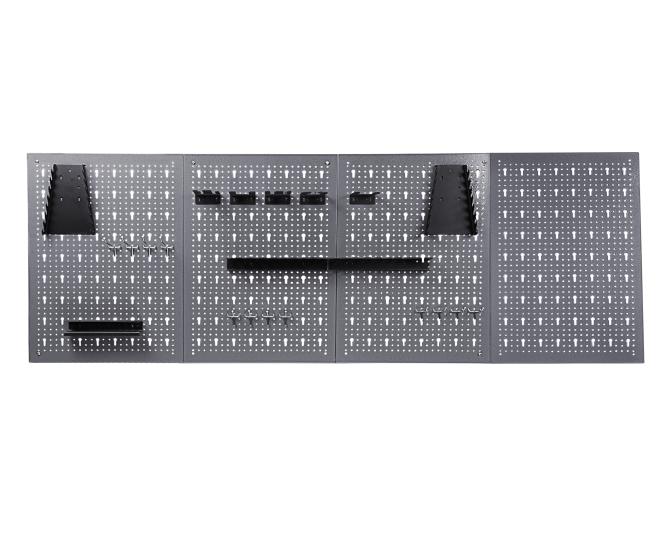 Mit dieser großen Lochwand inklusive Haken kann Ihre Karriere als Heimwerker Fahrt aufnehmen. Eine solche Werkzeugwand ist äußerst praktisch: Werkzeuge können einfach und übersichtlich in passender Höhe gelagert werden. Das bringt einen schnellen Zugriff auf Werkzeug und Zubehör. Außerdem können Sie sichergehen, dass sich empfindliche Werkzeugteile nicht berühren. Die Lochwand mit den Maßen von ca. 162 x 1 x 59 (H) cm ist aus Metall und wiegt ca. 4.5 kg. Sie bietet damit viel Platz, zum Beispiel für unser 22-teiliges Hakensortiment. Sie besteht aus vier Teilen (je ca. 40 x 57 cm), die auch voneinander getrennt an der Wand angebracht werden können. So können Sie ihre Werkstatt ganz flexibel nach Ihren Wünschen einrichten. Die einzelnen Lochwände können Sie mit Schrauben an die Wand dübeln. Außerdem hat jedes Lochwandteil eine Öse auf der Rückseite zum Aufhängen. Das schlichte Grau ist zeitlos und passt überall hin. Die Haken sind aus Metall und bieten Platz für 28 Bohrer, 16 Maulschlüssel oder Ringschlüssel, 20 Schraubendreher sowie 5 verschiedene Zangenhaken und 12 Einfachhaken. Bestellen Sie die Lochwand inklusive Hakensortiment am besten noch heute online bei uns. In unserem Online-Shop finden Sie auch passende Angebote zur Ergänzung für Ihre Werkstatt, vor allem verschiedenen Werkbänke. Alle Maßangaben sind Circa-Angaben und beziehen sich auf maximale Außenmaße des Artikels. Das Versandgewicht beruht ebenfalls auf Circa-Angaben. Sollten Sie genauere Angaben benötigen, wenden Sie sich bitte an unseren Support.