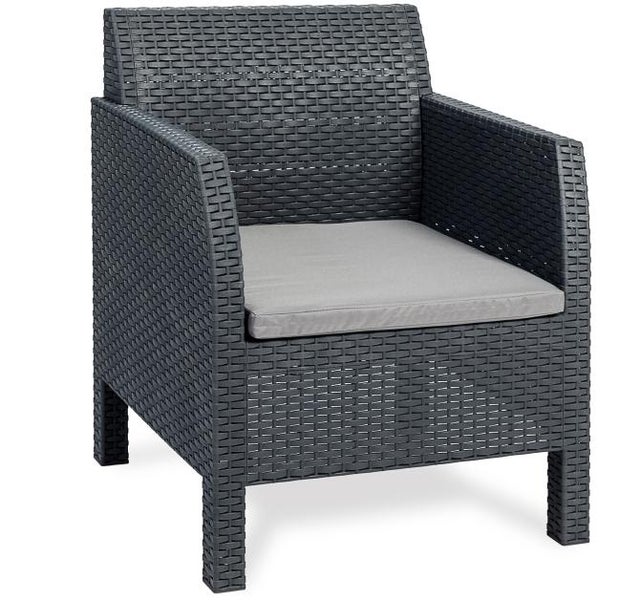 Garten- und Loungesessel mit bequemen Kissen für den Garten oder den Wintergarten, Hotel- oder Gastrobereich, hergestellt aus injiziertem Polypropylen, ergonomische Rückenlehne, inklusive abnehmbarer Kissen, Rattan-Korb-Design, schnelle Montage mit Kunststoffschrauben