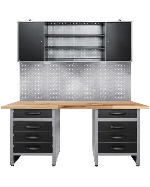 Werkstatteinrichtung 160 cm - Arbeitshöhe 85 cm - bestehend aus 2 x Werkbank (Bernd 60 cm), 1 x Werkstattschrank (160 cm), 4 x Lochwand, 2x LEDUnser Werkstatt Set ermöglicht bequemes Handwerken im Sitzen. Der geschaffene Freiraum bietet genügend Platz für eine Sitzgelegenheit, sodass Sie in Ruhe und entspannt arbeiten können. Die Sitznische ist auch zum Unterstellen von Werkstattwagen, Mülleimer oder Hocker geeignet.Die Werkbank Bernd besitzt die Maße die Maße von ca. 60 x 60 x 85 (H) cm und weist ebenfalls eine 28 mm starke Buchenholzplatte auf. Ausgestattet mit vier Schubladen (ca. 43 x 43 x 13 (H) cm) bieten diese ausreichend Stauraum, um Werkzeug und Werkstattzubehör sicher und einfach zu verstauen. Insgesamt ist die Werkbank Bernd bis zu 340 kg belastbar. Mithilfe von kugelgelagerten Schienen lassen sich die Schubladen unkompliziert schieben. Höhenverstellbare Füße sorgen für einen stabilen Stand sowie für ein bequemes Arbeiten auf der Werkbank Bernd.Der Werkzeugschrank Frank besitzt die Maße von ca. 160 x 20 x 60 (H) cm und wiegt nur erstaunliche 10 kg. Insgesamt besteht dieser Schrank aus drei Elementen: zwei großräumigen verschließbaren Schrankteilen (je ca. 40 x 16 x 58 (H) cm) und einem offenen Abteil (ca. 80 x 16 x 58 (H) cm). An der Rückwand beziehungsweise Euro-Lochwand lassen sich Haken platzieren, um Werkzeuge oder weiteres Zubehör einhängen zu können. Der Werkzeugschrank ist durch die großen stabilen Aufhängungen leicht und sicher an der Wand zu befestigen.Die Lochwand Olaf ist die optimale Ergänzung zu einer Werkbank in Ihrer Werkstatt. Die Lochwand besitzt die Maße von ca. 162 x 1,5 x 57 (H) cm und wiegt trotz ihrer enormen Stabilität nur 1 kg. Der Lochabstand beträgt 15 mm. Haken lassen sich in die Lochungen fest einklemmen und dienen somit als Halterung und Verstauung von Werkstattmaterial beziehungsweise von Werkzeug. Mit Schrauben können Sie die Öse auf der Rückseite an der Wand befestigen.Sie können die verschiedenen Einzelteile der Werkstatteinrichtung auch getrennt voneinander positionieren, um Ihre Werkstatt ganz individuell nach Ihren Wünschen zu gestalten. Weiterhin ist die Werkstatteinrichtung mit unseren anderen Werkstattartikeln problemlos erweiterbar!Der Aufbau der gesamten Einrichtung kann einige Stunden in Anspruch nehmen. Detaillierte Aufbauanleitungen finden Sie bei den Einzelartikeln in unserem Shop.Sie haben Gefallen an unserer Werkstatteinrichtung gefunden? Dann bestellen Sie sich noch heute Ihre eigene Werkstatteinrichtung direkt zu Ihnen nach Hause!Alle Maßangaben sind Circa Angaben und beziehen sich auf die maximalen Außenmaße des Artikels. Das Versandgewicht beruht ebenfalls auf Circa Angaben. Sollten Sie genauere Angaben benötigen, wenden Sie sich bitte an unseren Support.