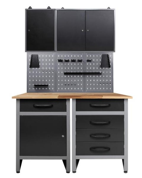 Werkstatteinrichtung 120 cm - Arbeitshöhe 85 cm - bestehend aus 2 x Werkbank (Wolle / Bernd), 2 x Werkstattschrank (42 cm / 80 cm), 3 x Lochwand, 1 x Lochwandhaken-SetDie Werkbank Wolle verfügt über einen abschließbaren Schrankteil, welcher mithilfe eines Sicherheitsschlosses dessen Inhalt geschützt hält. Ebenfalls enthält die Werkbank Wolle einen Einlegeboden für das Schrankteil, welcher je nach Platzbedarf eingebaut werden kann. Eine großräumige Schublade (ca. 43 x 43 x 13 (H) cm) dient dazu Kleinteile zu verstauen. Diese lässt sich ganz einfach mit den kugelgelagerten Führungsschienen schieben. Die 28 mm starke Holzplatte ist aus hochwertigem Buchenholz verleimt - dadurch ist sie top-solide!Die Werkbank Bernd besitzt die Maße die Maße von ca. 60 x 60 x 85 (H) cm und weist ebenfalls eine 28 mm starke Buchenholzplatte auf. Ausgestattet mit vier Schubladen (ca. 43 x 43 x 13 (H) cm) bieten diese ausreichend Stauraum, um Werkzeug und Werkstattzubehör sicher und einfach zu verstauen. Insgesamt ist die Werkbank Bernd bis zu 340 kg belastbar. Mithilfe von kugelgelagerten Schienen lassen sich die Schubladen unkompliziert schieben. Höhenverstellbare Füße sorgen für einen stabilen Stand sowie für ein bequemes Arbeiten auf der Werkbank Bernd.Der Werkzeugschrank Tim besitzt die Maße von ca. 42 x 20 x 60 (H) cm und wiegt nur erstaunliche 6 kg. Insgesamt kann dieser Schrank bis zu 30 kg tragen – genug für viele Werkzeuge. Die Rückwand des Schranks besteht aus einer Euro-Lochwand, an dieser lassen sich Haken platzieren, um Werkzeuge und weiteres Zubehör einzuhängen. Der Werkzeugschrank ist durch die großen stabilen Aufhängungen leicht und sicher an der Wand zu befestigen.Der Werkzeugschrank Ben besitzt die Maße von 80 x 20 x 60 (H) cm und wiegt nur 8 kg. Die beiden Einlegeböden des Werkzeugschrankes lassen sich beliebig je nach Bedürfnis einrichten. Durch die zwei abschließbaren Türen werden Ihre Geräte und Werkzeuge sicher aufbewahrt und sind vor Staub geschützt. Der Werkzeugschrank ist durch die großen stabilen Aufhängungen leicht und sicher an der Wand zu befestigen.Die Lochwand Olaf ist die optimale Ergänzung zu einer Werkbank in Ihrer Werkstatt. Die Lochwand besitzt die Maße von ca. 121,5 x 1,5 x 57 (H) cm und wiegt trotz ihrer enormen Stabilität nur 1 kg. Der Lochabstand beträgt 15mm. Haken lassen sich in die Lochungen fest einklemmen und dienen somit als Halterung und Verstauung von Werkstattmaterial beziehungsweise von Werkzeug. Mit Schrauben können Sie die Öse auf der Rückseite an der Wand befestigen.Das Lochwandhaken Set Hagen sorgt für Ordnung in Ihrer Werkstatt - alle Werkzeuge sind schnell greifbar.Sie können die verschiedenen Einzelteile der Werkstatteinrichtung auch getrennt voneinander positionieren, um Ihre Werkstatt ganz individuell nach Ihren Wünschen zu gestalten. Weiterhin ist die Werkstatteinrichtung mit unseren anderen Werkstattartikeln problemlos erweiterbar!Der Aufbau der gesamten Einrichtung kann einige Stunden in Anspruch nehmen. Detaillierte Aufbauanleitungen finden Sie bei den Einzelartikeln in unserem Shop.Sie haben Gefallen an unserer Werkstatteinrichtung gefunden? Dann bestellen Sie sich noch heute Ihre eigene Werkstatteinrichtung direkt zu Ihnen nach Hause!Alle Maßangaben sind Circa Angaben und beziehen sich auf die maximalen Außenmaße des Artikels. Das Versandgewicht beruht ebenfalls auf Circa Angaben. Sollten Sie genauere Angaben benötigen, wenden Sie sich bitte an unseren Support.