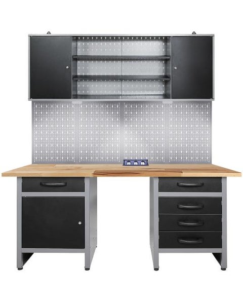 Werkstatteinrichtung 160 cm - Arbeitshöhe 85 cm - bestehend aus 2 x Werkbank (Wolle und Bernd je 60 cm), 1 x Werkstattschrank (160 cm), 4 x Lochwand, 1x versenkbare Steckdosenleiste, 2x LEDUnser Werkstatt Set ermöglicht bequemes Handwerken im Sitzen. Der geschaffene Freiraum bietet genügend Platz für eine Sitzgelegenheit, sodass Sie in Ruhe und entspannt arbeiten können. Die Sitznische ist auch zum Unterstellen von Werkstattwagen, Mülleimer oder Hocker geeignet.Die Werkbank Wolle verfügt über einen abschließbaren Schrankteil, welcher mithilfe eines Sicherheitsschlosses dessen Inhalt geschützt hält. Ebenfalls enthält die Werkbank Wolle einen Einlegeboden für das Schrankteil, welcher je nach Platzbedarf eingebaut werden kann. Eine großräumige Schublade (ca. 43 x 43 x 13 (H) cm) dient dazu Kleinteile zu verstauen. Diese lässt sich ganz einfach mit den kugelgelagerten Führungsschienen schieben. Die 28 mm starke Holzplatte ist aus hochwertigem Buchenholz verleimt - dadurch ist sie top-solide!Versenkbare Steckdosenleiste mit 3 Steckplätzen aus Metall, wird in der Arbeitsplatte versenkt und kann auf Knopfdruck geöffnet werden und nach Bedarf geschlossen werden um eine ebene Arbeitsfläche zu schaffen, nie wieder Steckdosen im Dunkeln unter dem Werktisch suchen, Strom ist dort wo man ihn braucht - sauber verstaut direkt am Arbeitsplatz.Die Werkbank Bernd besitzt die Maße die Maße von ca. 60 x 60 x 85 (H) cm und weist ebenfalls eine 28 mm starke Buchenholzplatte auf. Ausgestattet mit vier Schubladen (ca. 43 x 43 x 13 (H) cm) bieten diese ausreichend Stauraum, um Werkzeug und Werkstattzubehör sicher und einfach zu verstauen. Insgesamt ist die Werkbank Bernd bis zu 340 kg belastbar. Mithilfe von kugelgelagerten Schienen lassen sich die Schubladen unkompliziert schieben. Höhenverstellbare Füße sorgen für einen stabilen Stand sowie für ein bequemes Arbeiten auf der Werkbank Bernd.Der Werkzeugschrank Frank besitzt die Maße von ca. 160 x 20 x 60 (H) cm und wiegt nur erstaunliche 10 kg. Insgesamt besteht dieser Schrank aus drei Elementen: zwei großräumigen verschließbaren Schrankteilen (je ca. 40 x 16 x 58 (H) cm) und einem offenen Abteil (ca. 80 x 16 x 58 (H) cm). An der Rückwand beziehungsweise Euro-Lochwand lassen sich Haken platzieren, um Werkzeuge oder weiteres Zubehör einhängen zu können. Der Werkzeugschrank ist durch die großen stabilen Aufhängungen leicht und sicher an der Wand zu befestigen.Die Lochwand Olaf ist die optimale Ergänzung zu einer Werkbank in Ihrer Werkstatt. Die Lochwand besitzt die Maße von ca. 162 x 1,5 x 57 (H) cm und wiegt trotz ihrer enormen Stabilität nur 1 kg. Der Lochabstand beträgt 15 mm. Haken lassen sich in die Lochungen fest einklemmen und dienen somit als Halterung und Verstauung von Werkstattmaterial beziehungsweise von Werkzeug. Mit Schrauben können Sie die Öse auf der Rückseite an der Wand befestigen.Sie können die verschiedenen Einzelteile der Werkstatteinrichtung auch getrennt voneinander positionieren, um Ihre Werkstatt ganz individuell nach Ihren Wünschen zu gestalten. Weiterhin ist die Werkstatteinrichtung mit unseren anderen Werkstattartikeln problemlos erweiterbar!Der Aufbau der gesamten Einrichtung kann einige Stunden in Anspruch nehmen. Detaillierte Aufbauanleitungen finden Sie bei den Einzelartikeln in unserem Shop.Sie haben Gefallen an unserer Werkstatteinrichtung gefunden? Dann bestellen Sie sich noch heute Ihre eigene Werkstatteinrichtung direkt zu Ihnen nach Hause!Alle Maßangaben sind Circa Angaben und beziehen sich auf die maximalen Außenmaße des Artikels. Das Versandgewicht beruht ebenfalls auf Circa Angaben. Sollten Sie genauere Angaben benötigen, wenden Sie sich bitte an unseren Support.