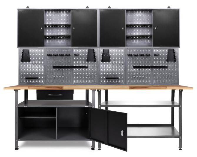 Werkstatteinrichtung 240 cm - Arbeitshöhe 85 cm - bestehend aus 2 x Werkbank (Klaus/Nobbi), 2 x Werkstattschrank (120 cm), 6 x Lochwand, 2 x Lochwandhaken-SetDie Werkbank Klaus verfügt über eine großräumige Schublade (ca. 43 x 43 x 13 (H) cm) sowie über zwei Schrankteile (je ca. 46 x 47 x 42 (H) cm), von denen eins verschließbar ist, das andere Schrankteil mit einem Einlegeboden ausgestattet ist. Insgesamt besitzt die Werkbank Klaus Maße von ca. 120 x 60 x 85 (H) cm und weist eine äußerst starke 28mm Buchenholzarbeitsplatteauf. Mithilfe des verschließbaren Schrankteils lässt sich auch großes Werkstattzubehör wie eine Bohrmaschine, Kabeltrommel und ein Fräser sicher und einfach verstauen. Höhenverstellbare Füße sorgen für einen stabilen Stand sowie für ein bequemes Arbeiten auf der Werkbank Klaus. Der Metallkorpus ist neben einem modernen Design auch durch seine Resistenz gegen Kratzern und Feuchtigkeit charakterisiert.Die Werkbank Nobbi mit den Maßen von ca. 120 x 60 x 85 (H) cm besitzt eine äußerst starke 32mm Holzplatte, ummantelt von einer Schicht Melaminharz. Die zwei großen Arbeitsflächen sind jeweils bis 80 kg belastbar und dienen zur Ablage für Werkzeuge wie Bohrmaschine und Fräser. Die zwei Zwischenböden sind jeweils ca. 100 x 50 cm groß und verleihen dem Werktisch nicht nur mehr Stabilität. Sondern bietet auch jede Menge Stauraum. Höhenverstellbare Füße sorgen für einen stabilen Stand sowie für ein bequemes Arbeiten auf der Werkbank Nobbi. Der Metallkorpus ist neben einem modernen Design auch durch seine Resistenz gegen Kratzern und Feuchtigkeit charakterisiert.Der Werkzeugschrank Kurt besitzt die Maße von ca. 120 x 19 x 60 (H) cm und wiegt nur erstaunliche 10 kg. Der Schrank besteht aus drei Elementen(insgesamt 120 cm): Zwei großen verschließbaren Schrankteilen und einem offenen Abteil (je ca. 40 x 16 x 58 (H) cm). An der dazugehörigen Euro-Lochwand lassen sich Haken platzieren und Werkstattgeräte, wie Bohrmaschine und Schleifgerät, einhängen. Der Werkzeugschrank ist durch die großen stabilen Aufhängungen leicht und sicher an der Wand zu befestigen. Der Metallkorpus ist neben einem modernen Design auch durch seine Resistenz gegen Kratzern und Feuchtigkeit ausgezeichnet.Die Lochwand Olaf ist die optimale Ergänzung zu einer Werkbank in Ihrer Werkstatt. Die Lochwand besitzt die Maße von ca. 243 x 1,5 x 57 (H) cm und wiegt trotz ihrer enormen Stabilität nur 1 kg. Haken lassen sich in die Lochungen fest einklemmen und dienen somit als Halterung und Verstauung von Werkstattmaterial beziehungsweise von Werkzeug. Mit Schrauben können Sie die Öse auf der Rückseite an der Wand befestigen.Das Lochwandhaken Set Hagen besteht aus 22 Teilen und sorgt somit für Ordnung in Ihrer Werkstatt. Dank der Lochwandhaken sind alles Werkzeuge schnell greifbar. Das Lochwandhaken Set beinhaltet: 4 Haken 12 cm, 4 Haken 8 cm, 4 Haken 6 cm; 5 Universalwerkzeughalter; 1 Bohrhalter für 28 Bohrer (3-12 mm); 2 Schlüsselhalter für 8 Schlüssel, 2 Schraubendreher Halter für 10 Schraubendreher. So können Sie unterschiedlichste Werkzeuge und Werkstattzubehör praktisch lagern.Sie können die verschiedenen Einzelteile der Werkstatteinrichtung auch getrennt voneinander positionieren, um Ihre Werkstatt ganz individuell nach Ihren Wünschen zu gestalten. Weiterhin ist die Werkstatteinrichtung mit unseren anderen Werkstattartikeln problemlos erweiterbar!Der Aufbau der gesamten Einrichtung kann einige Stunden in Anspruch nehmen. Detaillierte Aufbauanleitungen finden Sie bei den Einzelartikeln in unserem Shop.Sie haben Gefallen an unserer Werkstatteinrichtung gefunden? Dann bestellen Sie sich noch heute Ihre eigene Werkstatteinrichtung direkt zu Ihnen nach Hause!Alle Maßangaben sind Circa Angaben und beziehen sich auf die maximalen Außenmaße des Artikels. Das Versandgewicht beruht ebenfalls auf Circa Angaben. Sollten Sie genauere Angaben benötigen, wenden Sie sich bitte an unseren Support.