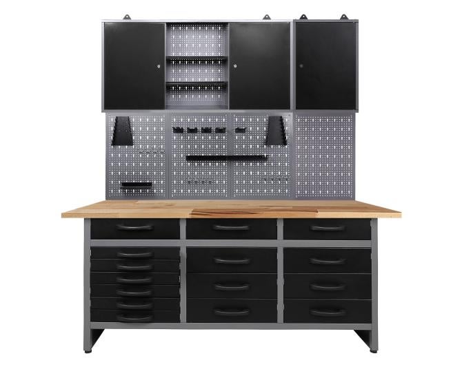 Werkstatteinrichtung 160 cm - Arbeitshöhe 85 cm - bestehend aus 1 x Werkbank (Konny), 2 x Werkstattschrank (42 cm / 120 cm), 4 x Lochwand, 1 x Lochwandhaken-SetDie Werkbank Konny besitzt die Maße von ca. 160 x 60 x 85 (H) cm und überzeugt mit einer stabilen 160 cm langen Holzplatte. Diese weist eine Stärke von 28 mm auf und ist aus hochwertigem Buchenholz verleimt - dadurch ist sie top-solide! Unter der Holzplatte befinden sich 15 Schubladen (je ca. 43 x 43 x 13 (H) cm), die jeweils bis zu 20 kg belastbar sind. Dadurch können Sie jegliches Werkzeug und Werkstattzubehör sicher verstauen. Mithilfe von kugelgelagerten Schienen lassen sich die Führungsschienen unkompliziert schieben. Höhenverstellbare Füße sorgen für einen stabilen Stand sowie für ein bequemes Arbeiten. Der Metallkorpus ist neben einem modernen Design auch durch seine Resistenz gegen Kratzern und Feuchtigkeit charakterisiert.Der Werkzeugschrank Tim besitzt die Maße von ca. 42 x 20 x 60 (H) cm und wiegt nur erstaunliche 6 kg. Insgesamt kann dieser Schrank bis zu 30 kg tragen –genug für viele Werkzeuge. Die Rückwand des Schranks besteht aus einer Euro-Lochwand, an dieser lassen sich Haken platzieren und Werkstattgeräte wie Bohrmaschine, Fräser und Schleifgerät einhängen. Der Werkzeugschrank ist durch die großen stabilen Aufhängungen leicht und sicher an der Wand zu befestigen. Der Metallkorpus ist neben einem modernen Design auch durch seine Resistenz gegen Kratzern und Feuchtigkeit ausgezeichnet.Der Werkzeugschrank Kurt besitzt die Maße von ca. 120 x 20 x 60 (H) cm und wiegt nur erstaunliche 10 kg. Der Schrank besteht aus drei Elementen(insgesamt 120 cm): Zwei großen verschließbaren Schrankteilen und einem offenen Abteil (je ca. 40 x 16 x 58 (H) cm). An der dazugehörigen Euro-Lochwand lassen sich Haken platzieren und Werkstattgeräte, wie Bohrmaschine und Schleifgerät, einhängen. Der Werkzeugschrank ist durch die großen stabilen Aufhängungen leicht und sicher an der Wand zu befestigen. Der Metallkorpus ist neben einem modernen Design auch durch seine Resistenz gegen Kratzern und Feuchtigkeit ausgezeichnet.Die Lochwand Olaf ist die optimale Ergänzung zu einer Werkbank in Ihrer Werkstatt. Die Lochwand besitzt die Maße von ca. 162 x 1,5 x 57 (H) cm und wiegt trotz ihrer enormen Stabilität nur 1 kg. Der Lochabstand beträgt 15 mm. Haken lassen sich in die Lochungen fest einklemmen und dienen somit als Halterung und Verstauung von Werkstattmaterial beziehungsweise von Werkzeug. Mit Schrauben können Sie die Öse auf der Rückseite an der Wand befestigen.Das Lochwandhaken Set Hagen sorgt für Ordnung in Ihrer Werkstatt - alle Werkzeuge sind schnell greifbar.Sie können die verschiedenen Einzelteile der Werkstatteinrichtung auch getrennt voneinander positionieren, um Ihre Werkstatt ganz individuell nach Ihren Wünschen zu gestalten. Weiterhin ist die Werkstatteinrichtung mit unseren anderen Werkstattartikeln problemlos erweiterbar!Der Aufbau der gesamten Einrichtung kann einige Stunden in Anspruch nehmen. Detaillierte Aufbauanleitungen finden Sie bei den Einzelartikeln in unserem Shop.Sie haben Gefallen an unserer Werkstatteinrichtung gefunden? Dann bestellen Sie sich noch heute Ihre eigene Werkstatteinrichtung direkt zu Ihnen nach Hause!Alle Maßangaben sind Circa Angaben und beziehen sich auf die maximalen Außenmaße des Artikels. Das Versandgewicht beruht ebenfalls auf Circa Angaben. Sollten Sie genauere Angaben benötigen, wenden Sie sich bitte an unseren Support.