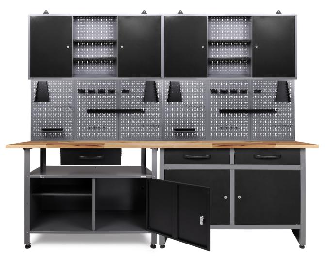 Werkstatteinrichtung 240 cm - Arbeitshöhe 85 cm - bestehend aus 2 x Werkbank (Werner/Klaus), 2 x Werkstattschrank (120 cm), 6 x Lochwand, 2 x Lochwandhaken-SetDie Werkbank Werner besitzt die Maße von ca. 120 x 60 x 85 (H) cm und weist eine äußerst starke 28 mm Holzplatte auf. Sie ist aus hochwertigem Buchenholz verleimt und dadurch ist sie top-solide! Die Werkbank Werner verfügt aus zwei verschiedenen Elementen. Zum einen aus zwei großräumigen Schubladen, zum anderen zwei verschließbare Schrankteile. Mithilfe dieser Stauraumfächer lassen sich Werkzeug und Werkstattzubehör sicher und einfach verstauen. Höhenverstellbare Füße sorgen für einen stabilen Stand sowie für ein bequemes Arbeiten auf der Werkbank Werner. Der Metallkorpus ist neben einem modernen Design auch durch seine Resistenz gegen Kratzern und Feuchtigkeit charakterisiert.Die Werkbank Klaus verfügt über eine großräumige Schublade sowie über zwei Schrankteile, von denen eins verschließbar ist, das andere Schrankteil mit einem Einlegeboden ausgestattet ist. Insgesamt besitzt die Werkbank Klaus Maße von ca. 120 x 60 x 95 (H) cm und weist ebenfalls eine starke 28 mm Buchenholzplatte auf. Mithilfe des verschließbaren Schrankteils lässt sich auch großes Werkstattzubehör wie eine Bohrmaschine, Kabeltrommel und ein Fräser sicher und einfach verstauen. Höhenverstellbare Füße sorgen für einen stabilen Stand sowie für ein bequemes Arbeiten auf der Werkbank Klaus. Der Werkzeugschrank Kurt besitzt die Maße von ca. 120 x 19 x 60 (H) cm und wiegt nur erstaunliche 10 kg. Der Schrank besteht aus drei Elementen (insgesamt 120 cm): Zwei großen verschließbaren Schrankteilen und einem offenen Abteil (je ca. 40 x 16 x 58 (H) cm). An der dazugehörigen Euro-Lochwand lassen sich Haken platzieren, um Werkzeuge einhängen zu können. Der Werkzeugschrank ist durch die großen stabilen Aufhängungen leicht und sicher an der Wand zu befestigen.Die Lochwand Olaf ist die optimale Ergänzung zu einer Werkbank in Ihrer Werkstatt. Die Lochwand besitzt die Maße von ca. 243 x 1,5 x 57 (H) cm und wiegt trotz ihrer enormen Stabilität nur 1 kg. Haken lassen sich in die Lochungen fest einklemmen und dienen somit als Halterung und Verstauung von Werkstattmaterial beziehungsweise von Werkzeug. Mit Schrauben können Sie die Öse auf der Rückseite an der Wand befestigen.Das Lochwandhaken Set Hagen sorgt für Ordnung in Ihrer Werkstatt - alle Werkzeuge sind schnell greifbar.Sie können die verschiedenen Einzelteile der Werkstatteinrichtung auch getrennt voneinander positionieren, um Ihre Werkstatt ganz individuell nach Ihren Wünschen zu gestalten. Weiterhin ist die Werkstatteinrichtung mit unseren anderen Werkstattartikeln problemlos erweiterbar!Der Aufbau der gesamten Einrichtung kann einige Stunden in Anspruch nehmen. Detaillierte Aufbauanleitungen finden Sie bei den Einzelartikeln in unserem Shop.Sie haben Gefallen an unserer Werkstatteinrichtung gefunden? Dann bestellen Sie sich noch heute Ihre eigene Werkstatteinrichtung direkt zu Ihnen nach Hause!Alle Maßangaben sind Circa Angaben und beziehen sich auf die maximalen Außenmaße des Artikels. Das Versandgewicht beruht ebenfalls auf Circa Angaben. Sollten Sie genauere Angaben benötigen, wenden Sie sich bitte an unseren Support.