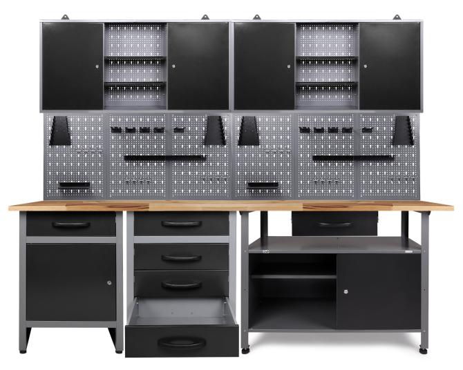Werkstatteinrichtung 240 cm - Arbeitshöhe 85 cm - bestehend aus 3 x Werkbank (Wolle / Bernd / Klaus), 2 x Werkstattschrank (120 cm), 6 x Lochwand, 2 x Lochwandhaken-SetDie Werkbank Klaus verfügt über einae großräumige Schublade sowie über zwei Schrankteile, von denen eins verschließbar ist, das andere Schrankteil mit einem Einlegeboden ausgestattet ist. Insgesamt besitzt die Werkbank Klaus Maße von ca. 120 x 60 x 85 (H) cm und weist eine äußerst starke 28 mm Holzplatte auf. Sie ist aus hochwertigem Buchenholz verleimt und dadurch ist sie top-solide! Mithilfe des verschließbaren Schrankteils lässt sich auch großes Werkstattzubehör wie eine Bohrmaschine, Kabeltrommel und ein Fräser sicher und einfach verstauen. Höhenverstellbare Füße sorgen für einen stabilen Stand sowie für ein bequemes Arbeiten auf der Werkbank Klaus. Der Metallkorpus ist neben einem modernen Design auch durch seine Resistenz gegen Kratzern und Feuchtigkeit charakterisiert.Die Werkbank Wolle verfügt über einen abschließbaren Schrankteil, welcher mithilfe eines Sicherheitsschlosses dessen Inhalt geschützt hält. Ebenfalls enthält die Werkbank Wolle einen Einlegeboden für das Schrankteil, welcher je nach Platzbedarf eingebaut werden kann. Eine großräumige Schublade (ca. 43 x 43x 13 (H) cm) dient dazu Kleinteile zu verstauen. Diese lässt sich ganz einfach mit den kugelgelagerten Führungsschienen schieben. Die 28 mm starke Holzplatte ist aus hochwertigem Buchenholz verleimt - dadurch ist sie top-solide! Sie bietet eine 60 x 60 cm große Arbeitsfläche.Die Werkbank Bernd besitzt die Maße die Maße von ca. 60 x 60 x 85 (H) cm und weist ebenfalls eine 28 mm starke Buchenholzplatte auf. Ausgestattet mit vier Schubladen (ca. 43 x 43 x 13 (H) cm) bieten diese ausreichend Stauraum, um Werkzeug und Werkstattzubehör sicher und einfach zu verstauen. Insgesamt ist die Werkbank Bernd bis zu 340 kg belastbar. Mithilfe von kugelgelagerten Schienen lassen sich die Schubladen unkompliziert schieben. Höhenverstellbare Füße sorgen für einen stabilen Stand sowie für ein bequemes Arbeiten auf der Werkbank Werner.Der Werkzeugschrank Kurt besitzt die Maße von ca. 120 x 19 x 60 (H) cm und wiegt nur erstaunliche 10 kg. Der Schrank besteht aus drei Elementen (insgesamt 120 cm): Zwei großen verschließbaren Schrankteilen und einem offenen Abteil (je ca. 40 x 16 x 58 (H) cm). An der dazugehörigen Euro-Lochwand lassen sich Haken platzieren, um Werkzeuge und Zubehör einhängen zu können. Der Werkzeugschrank ist durch die großen stabilen Aufhängungen leicht und sicher an der Wand zu befestigen.Die Lochwand Olaf ist die optimale Ergänzung zu einer Werkbank in Ihrer Werkstatt. Die Lochwand besitzt die Maße von ca. 243 x 1,5 x 57 (H) cm und wiegt trotz ihrer enormen Stabilität nur 1 kg. Der Lochabstand beträgt 15mm. Haken lassen sich in die Lochungen fest einklemmen und dienen somit als Halterung und Verstauung von Werkstattmaterial beziehungsweise von Werkzeug. Mit Schrauben können Sie die Öse auf der Rückseite an der Wand befestigen.Das Lochwandhaken Set Hagen sorgt für Ordnung in Ihrer Werkstatt - alle Werkzeuge sind schnell greifbar.Sie können die verschiedenen Einzelteile der Werkstatteinrichtung auch getrennt voneinander positionieren, um Ihre Werkstatt ganz individuell nach Ihren Wünschen zu gestalten. Weiterhin ist die Werkstatteinrichtung mit unseren anderen Werkstattartikeln problemlos erweiterbar!Der Aufbau der gesamten Einrichtung kann einige Stunden in Anspruch nehmen. Detaillierte Aufbauanleitungen finden Sie bei den Einzelartikeln in unserem Shop.Sie haben Gefallen an unserer Werkstatteinrichtung gefunden? Dann bestellen Sie sich noch heute Ihre eigene Werkstatteinrichtung direkt zu Ihnen nach Hause!Alle Maßangaben sind Circa Angaben und beziehen sich auf die maximalen Außenmaße des Artikels. Das Versandgewicht beruht ebenfalls auf Circa Angaben. Sollten Sie genauere Angaben benötigen, wenden Sie sich bitte an unseren Support.