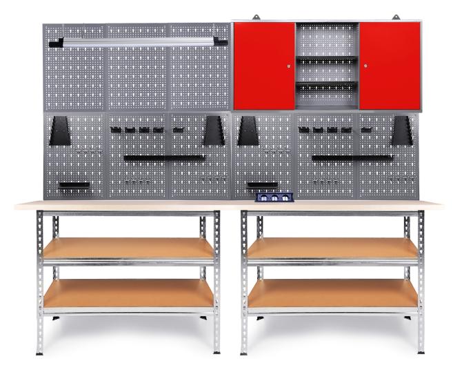 Werkstatteinrichtung 240 cm Uwe - Arbeitshöhe 92cm - bestehend aus 2 x Werkbank (Uwe), 1 x Werkstattschrank (120 cm), 6 x Lochwand, 2 x Lochwandhaken-Set, 1 x versenkbare Steckdose, 1x Bluetooth-LampeDie Werkbank Uwe besitzt eine stabile 120 cm lange Holzplatte, welche mit einer Melaminbeschichtung überzogen wurde und eine Stärke von 25 mm aufweist - dadurch ist sie top-solide!Unter der Arbeitsplatte befinden sich zwei große Ablageflächen (Gesamtbelastbarkeit jeweils 70 kg), wo sperriges Werkzeug oder Geräte wie Gießkannen und Bohrmaschinen untergebracht werden können. Die beiden Zwischenböden verleihen dem Werktisch nicht nur mehr Stabilität, sondern bieten auch jede Menge Stauraum, der effektiv genutzt werden kann und sind höhenverstellbar. So können Sie gerade nicht verwendete Werkzeuge einfach beiseitelegen und müssen sich bei der Arbeit nicht stören lassen. Den Arbeitsplatz können Sie voll und ganz nutzen.Insgesamt hat der Handwerktisch die Maße von ca. 120 x 60 x 92 (H) cm. Um für besondere Stabilität und Langlebigkeit zu sorgen, wurde der Packtisch aus Metall gefertigt und verzinkt. Dadurch ist der Werktisch auch vor Korrosion und Feuchtigkeit geschützt.Dank der mitgelieferten Aufbauanleitung haben Sie die Bank in etwa 20 Minuten aufgebaut. Neben dieser sind natürlich auch alle nötigen Zubehörteile im Paket enthalten.Der Werkzeugschrank Kurt besitzt die Maße von ca. 120 x 19 x 60 (H) cm und wiegt nur erstaunliche 10 kg. Der Schrank besteht aus drei Elementen(insgesamt 120 cm): Zwei großen verschließbaren Schrankteilen und einem offenen Abteil (je ca. 40 x 16 x 58 (H) cm). An der dazugehörigen Euro-Lochwand lassen sich Haken platzieren und Werkstattgeräte, wie Bohrmaschine und Schleifgerät, einhängen. Der Werkzeugschrank ist durch die großen stabilen Aufhängungen leicht und sicher an der Wand zu befestigen. Der Metallkorpus ist neben einem modernen Design auch durch seine Resistenz gegen Kratzern und Feuchtigkeit ausgezeichnet.Die Lochwand Olaf ist die optimale Ergänzung zu einer Werkbank in Ihrer Werkstatt. Die Lochwand besitzt die Maße von ca. 243 x 1,5 x 57 (H) cm und wiegt trotz ihrer enormen Stabilität nur 1 kg. Der Lochabstand beträgt 15 mm. Haken lassen sich in die Lochungen fest einklemmen und dienen somit als Halterung und Verstauung von Werkstattmaterial beziehungsweise von Werkzeug. Mit Schrauben können Sie die Öse auf der Rückseite an der Wand befestigen.Das Lochwandhaken Set Hagen besteht aus 22 Teilen und sorgt somit für Ordnung in Ihrer Werkstatt. Dank der Lochwandhaken sind alles Werkzeuge schnell greifbar. Das Lochwandhaken Set beinhaltet: 4 Haken 12 cm, 4 Haken 8 cm, 4 Haken 6 cm; 5 Universalwerkzeughalter; 1 Bohrhalter für 28 Bohrer (3-12 mm); 2 Schlüsselhalter für 8 Schlüssel, 2 Schraubendreher Halter für 10 Schraubendreher. So können Sie unterschiedlichste Werkzeuge und Werkstattzubehör praktisch lagern.Sie können die verschiedenen Einzelteile der Werkstatteinrichtung auch getrennt voneinander positionieren, um Ihre Werkstatt ganz individuell nach Ihren Wünschen zu gestalten. Weiterhin ist die Werkstatteinrichtung mit unseren anderen Werkstattartikeln problemlos erweiterbar!Der Aufbau der gesamten Einrichtung kann einige Stunden in Anspruch nehmen. Detaillierte Aufbauanleitungen finden Sie bei den Einzelartikeln in unserem Shop.Sie haben Gefallen an unserer Werkstatteinrichtung gefunden? Dann bestellen Sie sich noch heute Ihre eigene Werkstatteinrichtung direkt zu Ihnen nach Hause!Alle Maßangaben sind Circa Angaben und beziehen sich auf maximale Außenmaße des Artikels. Das Versandgewicht beruht ebenfalls auf Circa Angaben. Sollten Sie genauere Angaben benötigen, wenden sie sich bitte an unseren Support. Artikel wird ohne Deko geliefert.