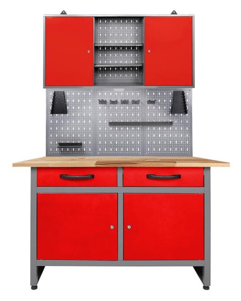 Werkstatteinrichtung 120 cm - Arbeitshöhe 85 cm - bestehend aus 1 x Werkbank (Werner), 1 x Werkstattschrank (120 cm), 3 x Lochwand, 1 x Lochwandhaken-Set, 1 x LEDDie Werkbank Werner besitzt die Maße von ca. 120 x 60 x 85 (H) cm und weist eine äußerst starke 28 mm Holzplatte auf. Sie ist aus hochwertigem Buchenholz verleimt und dadurch ist sie top-solide! Die Werkbank Werner verfügt aus zwei verschiedenen Elementen. Zum einen aus zwei großräumigen Schubladen, zum anderen zwei verschließbare Schrankteile. Mithilfe dieser Stauraumfächer lassen sich Werkzeug und Werkstattzubehör sicher und einfach verstauen. Höhenverstellbare Füße sorgen für einen stabilen Stand sowie für ein bequemes Arbeiten auf der Werkbank Werner. Der Metallkorpus ist neben einem modernen Design auch durch seine Resistenz gegen Kratzern und Feuchtigkeit charakterisiert.Der Werkzeugschrank Kurt besitzt die Maße von ca. 120 x 19 x 60 (H) cm und wiegt nur erstaunliche 10 kg. Der Schrank besteht aus drei Elementen (insgesamt 120 cm): Zwei großen verschließbaren Schrankteilen und einem offenen Abteil (je ca. 40 x 16 x 58 (H) cm). An der dazugehörigen Euro-Lochwand lassen sich Haken platzieren, um Werkzeuge oder weiteres Zubehör einzuhängen. Der Werkzeugschrank ist durch die großen stabilen Aufhängungen leicht und sicher an der Wand zu befestigen.Die Lochwand Olaf ist die optimale Ergänzung zu einer Werkbank in Ihrer Werkstatt. Die Lochwand besitzt die Maße von ca. 121,5 x 1,5 x 57 (H) cm und wiegt trotz ihrer enormen Stabilität nur 1 kg. Haken lassen sich in die Lochungen fest einklemmen und dienen somit als Halterung und Verstauung von Werkstattmaterial beziehungsweise von Werkzeug. Mit Schrauben können Sie die Öse auf der Rückseite an der Wand befestigen.Das Lochwandhaken Set Hagen sorgt für Ordnung in Ihrer Werkstatt - alle Werkzeuge sind schnell greifbar.Sie können die verschiedenen Einzelteile der Werkstatteinrichtung auch getrennt voneinander positionieren, um Ihre Werkstatt ganz individuell nach Ihren Wünschen zu gestalten. Weiterhin ist die Werkstatteinrichtung mit unseren anderen Werkstattartikeln problemlos erweiterbar!Der Aufbau der gesamten Einrichtung kann einige Stunden in Anspruch nehmen. Detaillierte Aufbauanleitungen finden Sie bei den Einzelartikeln in unserem Shop.Sie haben Gefallen an unserer Werkstatteinrichtung gefunden? Dann bestellen Sie sich noch heute Ihre eigene Werkstatteinrichtung direkt zu Ihnen nach Hause!Alle Maßangaben sind Circa Angaben und beziehen sich auf die maximalen Außenmaße des Artikels. Das Versandgewicht beruht ebenfalls auf Circa Angaben. Sollten Sie genauere Angaben benötigen, wenden Sie sich bitte an unseren Support.