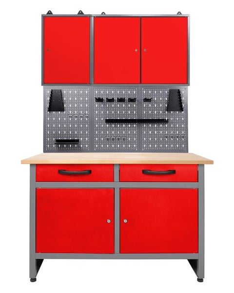 Werkstatteinrichtung 120 cm - Arbeitshöhe 95 cm - bestehend aus 1 x Werkbank (Werner), 2 x Werkstattschrank (42 cm / 80 cm), 3 x Lochwand, 1 x Lochwandhaken-SetDie Werkbank Werner besitzt die Maße von ca. 120 x 60 x 95 (H) cm und weist eine äußerst starke 28mm Buchenholz Arbeitsplatte auf. Zum einen aus zwei großräumigen Schubladen, zum anderen zwei verschließbare Schrankteile. Mithilfe dieser Stauraumfächer lassen sich Werkzeug und Werkstattzubehör sicher und einfach verstauen. Höhenverstellbare Füße sorgen für einen stabilen Stand sowie für ein bequemes Arbeiten auf der Werkbank Werner. Der Metallkorpus ist neben einem modernen Design auch durch seine Resistenz gegen Kratzern und Feuchtigkeit charakterisiert.Der Werkzeugschrank Tim besitzt die Maße von ca. 42 x 19 x 60 (H) cm und wiegt nur erstaunliche 6 kg. Insgesamt kann dieser Schrank bis zu 30 kg tragen –genug für viele Werkzeuge. Die Rückwand des Schranks besteht aus einer Euro-Lochwand, an dieser lassen sich Haken platzieren und Werkstattgeräte wie Bohrmaschine, Fräser und Schleifgerät einhängen. Der Werkzeugschrank ist durch die großen stabilen Aufhängungen leicht und sicher an der Wand zu befestigen. Der Metallkorpus ist neben einem modernen Design auch durch seine Resistenz gegen Kratzern und Feuchtigkeit ausgezeichnet.Der Werkzeugschrank Ben besitzt die Maße von ca. 80 x 19 x 60 (H) cm und wiegt nur 8 kg. Mithilfe der Euro-Lochwand lassen sich Haken platzieren und Werkstattgeräte wie Bohrmaschine, Fräser und Schleifgerät einhängen. Die beiden Einlegeböden des Werkzeugschrankes lassen sich beliebig je nach Bedürfnis einrichten. Durch die zwei abschließbaren Türen werden Ihre Geräte und Werkzeuge sicher aufbewahrt und sind vor Staub geschützt. Der Werkzeugschrank ist durch die großen stabilen Aufhängungen leicht und sicher an der Wand zu befestigen. Der Metallkorpus ist neben einem modernen Design auch durch seine Resistenz gegen Kratzern und Feuchtigkeit ausgezeichnet.Die Lochwand Olaf ist die optimale Ergänzung zu einer Werkbank in Ihrer Werkstatt. Die Lochwand besitzt die Maße von ca. 121,5 x 1,5 x 57 (H) cm und wiegt trotz ihrer enormen Stabilität nur 1 kg. Haken lassen sich in die Lochungen fest einklemmen und dienen somit als Halterung und Verstauung von Werkstattmaterial beziehungsweise von Werkzeug. Mit Schrauben können Sie die Öse auf der Rückseite an der Wand befestigen.Das Lochwandhaken Set Hagen besteht aus 22 Teilen und sorgt somit für Ordnung in Ihrer Werkstatt. Dank der Lochwandhaken sind alles Werkzeuge schnell greifbar. Das Lochwandhaken Set beinhaltet: 4 Haken 12 cm, 4 Haken 8 cm, 4 Haken 6 cm; 5 Universalwerkzeughalter; 1 Bohrhalter für 28 Bohrer (3-12 mm); 2 Schlüsselhalter für 8 Schlüssel, 2 Schraubendreher Halter für 10 Schraubendreher. So können Sie unterschiedlichste Werkzeuge und Werkstattzubehör praktisch lagern.Sie können die verschiedenen Einzelteile der Werkstatteinrichtung auch getrennt voneinander positionieren, um Ihre Werkstatt ganz individuell nach Ihren Wünschen zu gestalten. Weiterhin ist die Werkstatteinrichtung mit unseren anderen Werkstattartikeln problemlos erweiterbar!Der Aufbau der gesamten Einrichtung kann einige Stunden in Anspruch nehmen. Detaillierte Aufbauanleitungen finden Sie bei den Einzelartikeln in unserem Shop.Sie haben Gefallen an unserer Werkstatteinrichtung gefunden? Dann bestellen Sie sich noch heute Ihre eigene Werkstatteinrichtung direkt zu Ihnen nach Hause!Alle Maßangaben sind Circa Angaben und beziehen sich auf die maximalen Außenmaße des Artikels. Das Versandgewicht beruht ebenfalls auf Circa Angaben. Sollten Sie genauere Angaben benötigen, wenden Sie sich bitte an unseren Support.