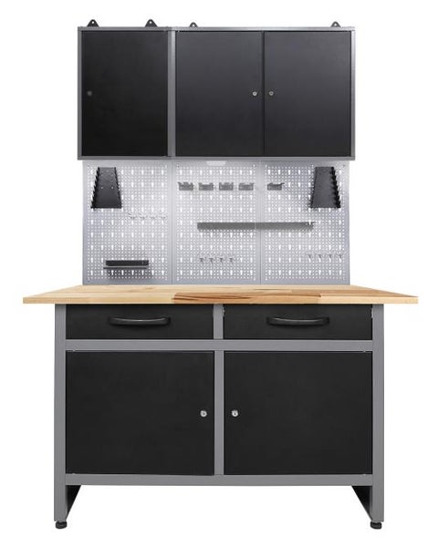Werkstatteinrichtung 120 cm - Arbeitshöhe 85 cm - bestehend aus 1 x Werkbank (Werner), 2 x Werkstattschrank (42 cm / 80 cm), 3 x Lochwand, 1 x Lochwandhaken-Set , 1 x LEDDie Werkbank Werner besitzt die Maße von ca. 120 x 60 x 85 (H) cm und weist eine äußerst starke 28 mm Holzplatte auf. Sie ist aus hochwertigem Buchenholz verleimt und dadurch ist sie top-solide! Die Werkbank Werner verfügt aus zwei verschiedenen Elementen. Zum einen aus zwei großräumigen Schubladen, zum anderen zwei verschließbare Schrankteile. Mithilfe dieser Stauraumfächer lassen sich Werkzeug und Werkstattzubehör sicher und einfach verstauen. Höhenverstellbare Füße sorgen für einen stabilen Stand sowie für ein bequemes Arbeiten auf der Werkbank Werner. Der Metallkorpus ist neben einem modernen Design auch durch seine Resistenz gegen Kratzern und Feuchtigkeit charakterisiert.Der Werkzeugschrank Tim besitzt die Maße von ca. 42 x 20 x 60 (H) cm und wiegt nur erstaunliche 6 kg. Insgesamt kann dieser Schrank bis zu 30 kg tragen – genug für viele Werkzeuge. Die Rückwand des Schranks besteht aus einer Euro-Lochwand, an dieser lassen sich Haken platzieren, um Werkzeuge und weiteres Zubehör einzuhängen. Der Werkzeugschrank ist durch die großen stabilen Aufhängungen leicht und sicher an der Wand zu befestigen.Der Werkzeugschrank Ben besitzt die Maße von 80 x 20 x 60 (H) cm und wiegt nur 8 kg. Die beiden Einlegeböden des Werkzeugschrankes lassen sich beliebig je nach Bedürfnis einrichten. Durch die zwei abschließbaren Türen werden Ihre Geräte und Werkzeuge sicher aufbewahrt und sind vor Staub geschützt. Der Werkzeugschrank ist durch die großen stabilen Aufhängungen leicht und sicher an der Wand zu befestigen.Die Lochwand Olaf ist die optimale Ergänzung zu einer Werkbank in Ihrer Werkstatt. Die Lochwand besitzt die Maße von ca. 121,5 x 1,5 x 57 (H) cm und wiegt trotz ihrer enormen Stabilität nur 1 kg. Haken lassen sich in die Lochungen fest einklemmen und dienen somit als Halterung und Verstauung von Werkstattmaterial beziehungsweise von Werkzeug. Mit Schrauben können Sie die Öse auf der Rückseite an der Wand befestigen.Das Lochwandhaken Set Hagen sorgt für Ordnung in Ihrer Werkstatt - alle Werkzeuge sind schnell greifbar.Sie können die verschiedenen Einzelteile der Werkstatteinrichtung auch getrennt voneinander positionieren, um Ihre Werkstatt ganz individuell nach Ihren Wünschen zu gestalten. Weiterhin ist die Werkstatteinrichtung mit unseren anderen Werkstattartikeln problemlos erweiterbar!Der Aufbau der gesamten Einrichtung kann einige Stunden in Anspruch nehmen. Detaillierte Aufbauanleitungen finden Sie bei den Einzelartikeln in unserem Shop.Sie haben Gefallen an unserer Werkstatteinrichtung gefunden? Dann bestellen Sie sich noch heute Ihre eigene Werkstatteinrichtung direkt zu Ihnen nach Hause!Alle Maßangaben sind Circa Angaben und beziehen sich auf die maximalen Außenmaße des Artikels. Das Versandgewicht beruht ebenfalls auf Circa Angaben. Sollten Sie genauere Angaben benötigen, wenden Sie sich bitte an unseren Support.