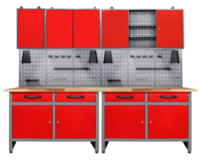 Werkstatteinrichtung 240 cm - Arbeitshöhe 85 cm - bestehend aus 2 x Werkbank (Werner), 3 x Werkstattschrank (42 cm / 80 cm / 120 cm), 6 x Lochwand, 2 x Lochwandhaken-Set, 2 x LEDDie Werkbank Werner besitzt die Maße von ca. 120 x 60 x 85 (H) cm und weist eine äußerst starke 28 mm Holzplatte auf. Sie ist aus hochwertigem Buchenholz verleimt und dadurch ist sie top-solide! Die Werkbank Werner verfügt aus zwei verschiedenen Elementen. Zum einen aus zwei großräumigen Schubladen, zum anderen zwei verschließbare Schrankteile. Mithilfe dieser Stauraumfächer lassen sich Werkzeug und Werkstattzubehör sicher und einfach verstauen. Höhenverstellbare Füße sorgen für einen stabilen Stand sowie für ein bequemes Arbeiten auf der Werkbank Werner. Der Metallkorpus ist neben einem modernen Design auch durch seine Resistenz gegen Kratzern und Feuchtigkeit charakterisiert.Der Werkzeugschrank Tim besitzt die Maße von ca. 42 x 20 x 60 (H) cm und wiegt nur erstaunliche 6 kg. Insgesamt kann dieser Schrank bis zu 30 kg tragen – genug für viele Werkzeuge. Die Rückwand des Schranks besteht aus einer Euro-Lochwand, an dieser lassen sich Haken platzieren, um Werkzeuge und weiteres Zubehör einzuhängen. Der Werkzeugschrank ist durch die großen stabilen Aufhängungen leicht und sicher an der Wand zu befestigen.Der Werkzeugschrank Ben besitzt die Maße von 80 x 20 x 60 (H) cm und wiegt nur 8 kg. Die beiden Einlegeböden des Werkzeugschrankes lassen sich beliebig je nach Bedürfnis einrichten. Durch die zwei abschließbaren Türen werden Ihre Geräte und Werkzeuge sicher aufbewahrt und sind vor Staub geschützt. Der Werkzeugschrank ist durch die großen stabilen Aufhängungen leicht und sicher an der Wand zu befestigen.Der Werkzeugschrank Kurt besitzt die Maße von ca. 120 x 19 x 60 (H) cm und wiegt nur erstaunliche 10 kg. Der Schrank besteht aus drei Elementen (insgesamt 120 cm): Zwei großen verschließbaren Schrankteilen und einem offenen Abteil (je ca. 40 x 16 x 58 (H) cm). An der dazugehörigen Euro-Lochwand lassen sich Haken platzieren, um Werkzeuge oder weiteres Zubehör einzuhängen. Der Werkzeugschrank ist durch die großen stabilen Aufhängungen leicht und sicher an der Wand zu befestigen.Die Lochwand Olaf ist die optimale Ergänzung zu einer Werkbank in Ihrer Werkstatt. Die Lochwand besitzt die Maße von ca. 243 x 1,5 x 57 (H) cm und wiegt trotz ihrer enormen Stabilität nur 1 kg. Haken lassen sich in die Lochungen fest einklemmen und dienen somit als Halterung und Verstauung von Werkstattmaterial beziehungsweise von Werkzeug. Mit Schrauben können Sie die Öse auf der Rückseite an der Wand befestigen.Das Lochwandhaken Set Hagen sorgt für Ordnung in Ihrer Werkstatt - alle Werkzeuge sind schnell greifbar.Sie können die verschiedenen Einzelteile der Werkstatteinrichtung auch getrennt voneinander positionieren, um Ihre Werkstatt ganz individuell nach Ihren Wünschen zu gestalten. Weiterhin ist die Werkstatteinrichtung mit unseren anderen Werkstattartikeln problemlos erweiterbar!Der Aufbau der gesamten Einrichtung kann einige Stunden in Anspruch nehmen. Detaillierte Aufbauanleitungen finden Sie bei den Einzelartikeln in unserem Shop.Sie haben Gefallen an unserer Werkstatteinrichtung gefunden? Dann bestellen Sie sich noch heute Ihre eigene Werkstatteinrichtung direkt zu Ihnen nach Hause!Alle Maßangaben sind Circa Angaben und beziehen sich auf die maximalen Außenmaße des Artikels. Das Versandgewicht beruht ebenfalls auf Circa Angaben. Sollten Sie genauere Angaben benötigen, wenden Sie sich bitte an unseren Support.