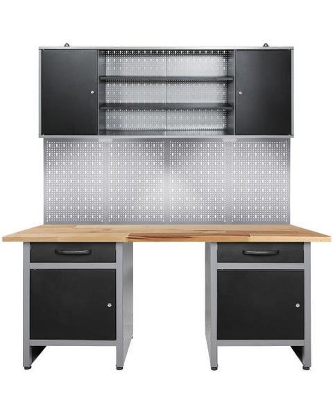 Werkstatteinrichtung 160 cm - Arbeitshöhe 85 cm - bestehend aus 2 x Werkbank (Wolle 60 cm), 1 x Werkstattschrank (160 cm), 4 x Lochwand, 2x LEDUnser Werkstatt Set ermöglicht bequemes Handwerken im Sitzen. Der geschaffene Freiraum bietet genügend Platz für eine Sitzgelegenheit, sodass Sie in Ruhe und entspannt arbeiten können. Die Sitznische ist auch zum Unterstellen von Werkstattwagen, Mülleimer oder Hocker geeignet.Die Werkbank Wolle verfügt über einen abschließbaren Schrankteil, welcher mithilfe eines Sicherheitsschlosses dessen Inhalt geschützt hält. Ebenfalls enthält der Werkbank Wolle einen Einlegeboden für das Schrankteil, welcher je nach Platzbedarf eingebaut werden kann. Hinzu eine großräumige Schublade (ca. 43 x 43x 13 (H) cm) um Kleinteile zu verstauen. Diese lässt sich ganz einfach mit den kugelgelagerten Führungsschienen schieben. Die 28 mm starke Buchenholzplatte bietet eine 160 x 60 cm große Arbeitsfläche, die in jede Garage oder Keller passt. Der Metallkorpus ist neben einem modernen Design auch durch seine Resistenz gegen Kratzern und Feuchtigkeit charakterisiert.Der Werkzeugschrank Frank besitzt die Maße von ca. 160 x 20 x 60 (H) cm und wiegt nur erstaunliche 10 kg. Insgesamt besteht dieser Schrank aus drei Elementen: zwei großräumischen verschließbaren Schrankteilen (je ca. 40 x 16 x 58 (H)) und einem offenen Abteil (ca. 80 x 16 x 58 (H) cm). An der Rückwand beziehungsweise Euro-Lochwand lassen sich Haken platzieren und Werkstattgeräte wie Bohrmaschine und Schleifgerät einhängen. Der Werkzeugschrank ist durch die großen stabilen Aufhängungen leicht und sicher an der Wand zu befestigen. Der Metallkorpus ist neben einem modernen Design auch durch seine Resistenz gegen Kratzern und Feuchtigkeit charakterisiert.Die Lochwand Olaf ist die optimale Ergänzung zu einer Werkbank in Ihrer Werkstatt. Die Lochwand besitzt die Maße von ca. 162 x 1,5 x 57 (H) cm und wiegt trotz ihrer enormen Stabilität nur 1 kg. Der Lochabstand beträgt 15 mm. Haken lassen sich in die Lochungen fest einklemmen und dienen somit als Halterung und Verstauung von Werkstattmaterial beziehungsweise von Werkzeug. Mit Schrauben können Sie die Öse auf der Rückseite an der Wand befestigen.Sie können die verschiedenen Einzelteile der Werkstatteinrichtung auch getrennt voneinander positionieren, um Ihre Werkstatt ganz individuell nach Ihren Wünschen zu gestalten. Weiterhin ist die Werkstatteinrichtung mit unseren anderen Werkstattartikeln problemlos erweiterbar!Der Aufbau der gesamten Einrichtung kann einige Stunden in Anspruch nehmen. Detaillierte Aufbauanleitungen finden Sie bei den Einzelartikeln in unserem Shop.Sie haben Gefallen an unserer Werkstatteinrichtung gefunden? Dann bestellen Sie sich noch heute Ihre eigene Werkstatteinrichtung direkt zu Ihnen nach Hause!Alle Maßangaben sind Circa Angaben und beziehen sich auf die maximalen Außenmaße des Artikels. Das Versandgewicht beruht ebenfalls auf Circa Angaben. Sollten Sie genauere Angaben benötigen, wenden Sie sich bitte an unseren Support.
