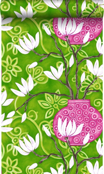 Diese farbenfrohe Tapete mit Magnolien in Grün und Rosa macht jede Wand zu einem echten Hingucker und lässt eine lebendige Atmosphäre entstehen. Die dezenten Glanz-Effekte verleihen der Tapete zudem eine edle Optik.
