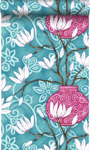 Diese farbenfrohe Tapete mit Magnolien in Türkis und Rosa macht jede Wand zu einem echten Hingucker und lässt eine lebendige Atmosphäre entstehen. Die dezenten Glanz-Effekte verleihen der Tapete zudem eine edle Optik.