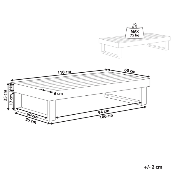 Couchtisch für den Außenbereich. Dieser Couchtisch aus zertifiziertem Akazienholz verbindet Langlebigkeit mit natürlicher Eleganz. Perfekt für Terrassen oder überdachte Balkone, bietet er eine robuste und dennoch stilvolle Oberfläche für Ihre Zusammenkünfte im Garten. Praktisch und raffiniert zugleich, fügt sich dieser Tisch in jede Sitzgarnitur ein und verleiht Ihrem Wohnbereich im Außenbereich eine raffinierte Note. Details: Typ Gartentisch. Stil: Rustikal. Farbe: Braun. Material: Holz. Material: FSC® zertifiziertes Akazienholz. Gestellmaterial: Holz. Tischplattenmaterial: Holz. Form: Rechteckig. Finish: Geölt. Abmessungen: Breite: 110 cm. Länge: 60 cm. Höhe: 25 cm. Gewicht: 13 kg. Max. Belastung: 75 kg. .Sie kaufen: 1 x Couchtisch. Produktvorteile: Moderne Terrassen- und Gartenmöbel, Die natürliche Holzmaserung und Knoten machen jedes Stück zu einem Unikat, Passt wunderbar zu jedem Einrichtungsstil, Hochwertiges Material, Stabile und solide Konstruktion, Damit die Qualität des Artikels erhalten bleibt, sollte er vor Wasser und Regen geschützt werden. Montage: Nicht montiert.5 - 15 Min. Zusatzinformationen: Bitte beachten Sie, dass erhebliche Wassereinwirkung die geölte Deckschicht beschädigen kann. Damit das folgende Produkt jahrelang seine Schönheit beibehält, stellen wir Ihnen ein ausführliches Pflegehandbuch zur Verfügung. Die Pflegeanleitung und Tipps zur richtigen Wartung Ihres neuen Produkts finden Sie finden Sie unten im Abschnitt „Verpackung und Montage“. Pflegeanleitung: FSC® zertifiziertes Akazienholz: 1.Bitte ausschließlich milde Reinigungsmittel und weiche Tücher verwenden. Dabei immer in Richtung der Maserung abwischen. Feuchte Stellen sofort mit einem weichen Tuch trocken reiben und Dauernässe bei der Reinigung vermeiden. 2.Geöltes Holz sollte vor der Benutzung und nach der Saison vor der Einlagerung nachgeölt werden, besonders bei feuchtem Klima. 3.Wir empfehlen bei ungünstigen Witterungsbedingungen und für die Wintersaison eine Schutzabdeckung zu verwenden oder, wenn möglich, die Gartenmöbel trocken und kühl drinnen zu lagern.