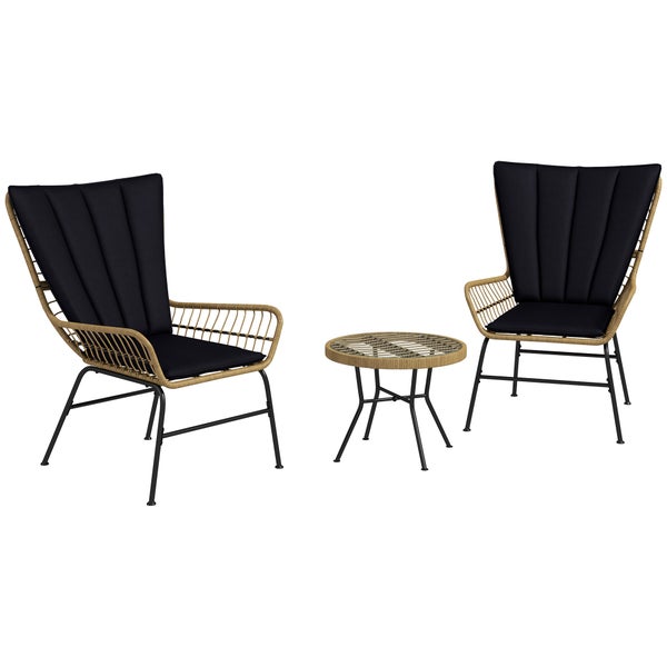 Outsunny 3-teilige Rattan-Sitzgruppe, Gartengarnitur, Gartenmöbel-Set mit 2 Stühlen, Beistelltisch mit Hartglasplatte, Kissen, für Balkon, Terrasse, Natur & Schwarz