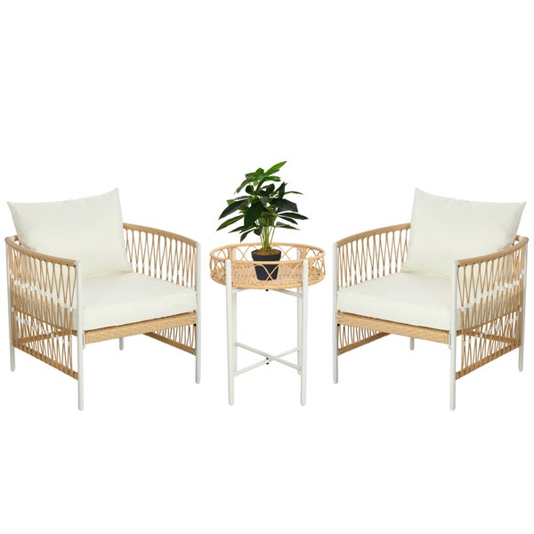 Verwandeln Sie Ihren Garten in einen Treffpunkt mit unserem Outsunny Rattan Bistro-Set. Ein charmantes Set, das Ihren Gartenmöbeln einen eleganten Touch verleiht. Genießen Sie den Komfort der dick gepolsterten Sitz- und Rückenkissen mit waschbaren Bezügen für eine mühelose Pflege. Eine stilvolle Ergänzung für jeden Balkon oder jede Terrasse ist dieses dreiteilige Terrassenset, bestehend aus zwei handgeflochtenen PE-Rattanstühlen und einem passenden Couchtisch.