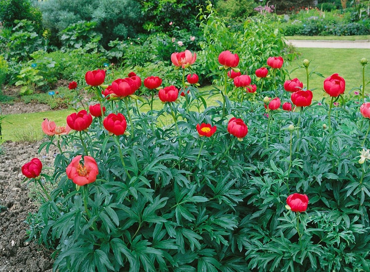 Paeonia peregrina, die Balkan-Pfingstrose, ist eine elegante Staudenpfingstrose, die mit tiefroten, halbgefüllten bis gefüllten Blüten und sattem, glänzend grünem, fein gefiedertem Laub begeistert. Als klassische Blütenstaude entfaltet sie im späten Frühjahr bis frühen Sommer, meist im Mai bis Juni, ihre eindrucksvolle Blütenpracht und setzt im Staudenbeet, in der Rabatte und im Bauerngarten leuchtende Akzente. Der horstige, buschige Wuchs bleibt mit etwa 50 bis 70 cm Höhe kompakt, wodurch sich diese Zierstaude sowohl als Solitär im Vorgarten als auch in harmonischen Gruppenpflanzungen einsetzen lässt; in ausreichend großen Gefäßen eignet sie sich zudem als dauerhafte Kübelpflanze für Terrasse und geschützte Sitzplätze. Als Schnittstaude liefert sie standfeste Stiele mit edlen Knospen, die in der Vase besonders wirkungsvoll sind. Am besten gedeiht Paeonia peregrina an einem sonnigen bis halbschattigen Standort auf durchlässigen, nährstoffreichen, humosen und gerne leicht kalkhaltigen Böden; Staunässe ist zu vermeiden. Die Pflanztiefe sollte flach gewählt werden, sodass die Vegetationsknospen nur wenige Zentimeter mit Erde bedeckt sind, denn so bildet die Pfingstrose zuverlässig Blüten. Als langlebige Gartenstaude schätzt sie Ruhe am Standort und dankt es mit jahrelanger Blühfreude; Umpflanzen sollte man möglichst vermeiden. Nach dem Austrieb im Frühjahr entwickelt sich der dichte Blattschopf, im Sommer überzeugt die Pflanze mit vitalem, dekorativem Laub, und im Herbst zieht die Staude ein, um im nächsten Jahr wieder kräftig auszutreiben. Ein lockerer Winterschutz auf frisch gepflanzten Exemplaren kann hilfreich sein.
