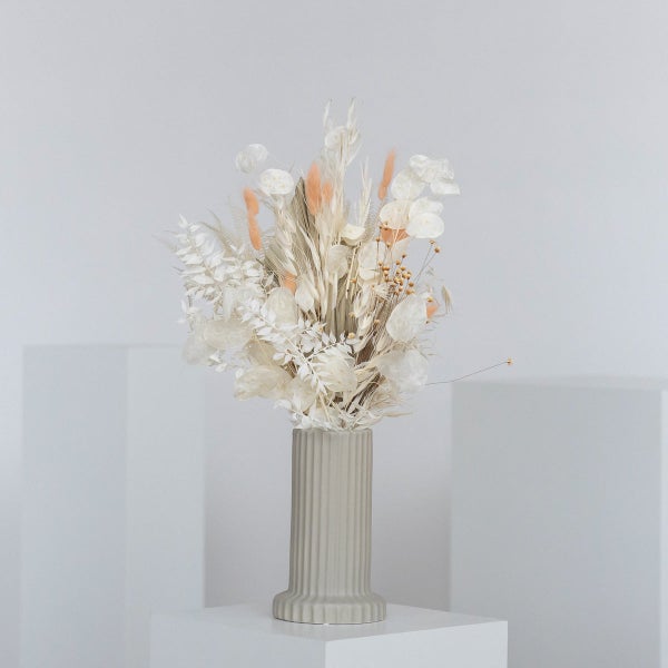 Der Trockenblumenstrauß Palm Peach lässt die Vorfreude auf den Sommer steigen. Die leichten grün Töne der Palmblätter umspielt von weißen Trockenblumen wie Ruskus und Lunaria bilden ein harmonisches Gesamtbild. Die lachsfarbenen Lagurus in Kombination mit den orangenen Glixia geben dem Strauß eine natürliche frische. Hafer bringt ein luftiges Erscheinungsbild und lockert den Strauß auf.