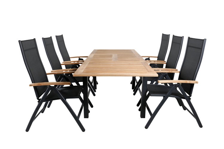 Panama Gartentisch 90x152/210cm und 6 Stühle Panama Schwarz, Natur ist ein Gartentisch in der Farbe Schwarz, der sowohl Stil als auch Funktionalität in Ihr Zuhause bringt. Panama Gartenset Tisch 90x152/210cm und 6 Stühle Panama schwarz, natur. inkl. Zusatzplatten: Ja. Tischlänge ohne Zusatzplatten: 152cm. Tischlänge mit zusätzlichen Platten: 210 cm. Tisch: B 90 x H 74 x L 152 cm. Stuhl: B 59 x H 108 x T 75 cm. Sitzhöhe: 43 cm. Sitztiefe: 42 cm. Sitzbreite: 42 cm. Armlehnenhöhe: 62 cm. Maximales Gewicht des Stuhls: 0 kg. Kissen: Nein. Stuhl stapelbar: Nein. Stuhl verstellbar: Ja. Dieses Produkt wurde mit viel Liebe zum Detail hergestellt, was sowohl Ästhetik als auch hohe Haltbarkeit gewährleistet. Bei der Gestaltung wurde sowohl auf Funktionalität als auch auf Stil geachtet, was es zur perfekten Wahl für jeden Raum in Ihrem Zuhause macht. Die verwendeten Materialien sind von hoher Qualität, was dem Produkt eine lange Lebensdauer verleiht und dafür sorgt, dass es dem täglichen Gebrauch standhält. Ob zur Aufbewahrung oder als dekorative Ergänzung, dieses Produkt wertet Ihre Einrichtung auf und bringt zusätzlichen Komfort und Eleganz in Ihr Zuhause.