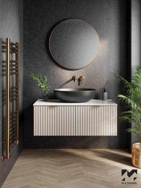 Im Inneren steckt ein Medite Exterior MDF-Kern – wasserresistent, robust und geprüft nach allen Standards (BS EN 622 Teil 5, DIN EN 335-3). Genau das, was du brauchst in Bad, Dusche oder jedem anderen Feuchtraum. Kein Aufquellen, kein Verziehen. Außen sorgt ein hochwertiges Hochdrucklaminat für den Look, der Eindruck hinterlässt – dauerhaft, pflegeleicht und stylisch.