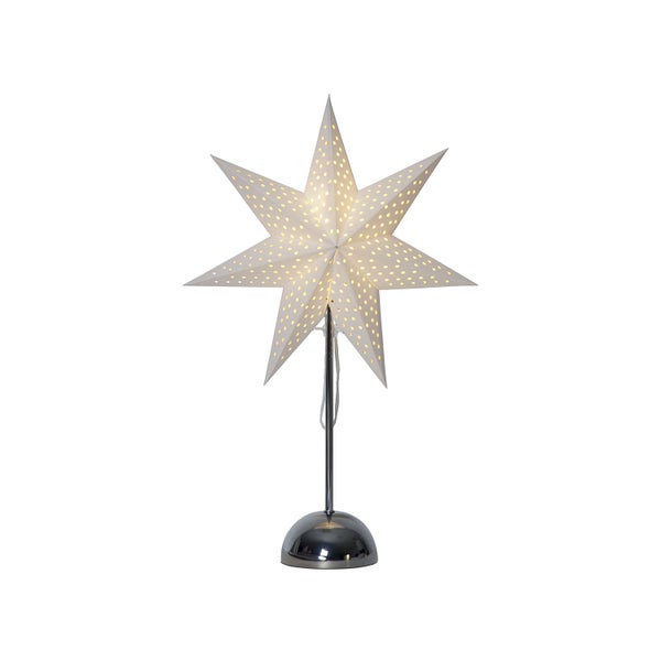 - Der Standleuchten Stern Lottie besteht aus einem weißen Papierstern, welcher sich auf einem chromfarbenem Ständer befindet