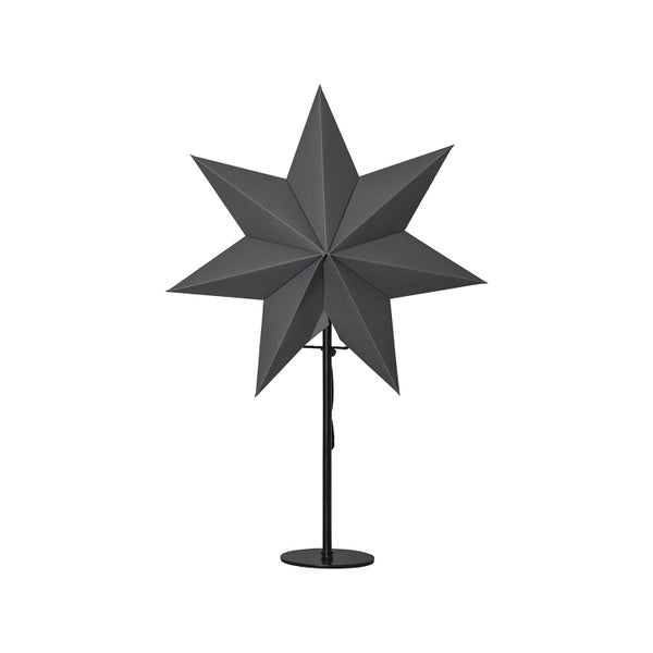 - Der Standleuchten Stern Mixa besteht aus einem schwarzen Papierstern, welcher sich auf einem schwarzen Ständer befindet
