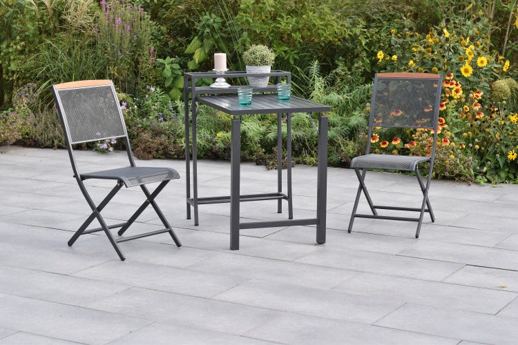 Das Gartenmöbelset besteht aus zwei Klappstühlen, deren Sitz- und Rückenflächen aus einen graphitfarbenen Stahlgeflecht gefertigt sind. Der Rückenabschluss aus edlem Akazienholz sorgt für zusätzliche Gemütlichkeit und eine ansprechende Optik. Mit der Klappfunktion verstauen Sie das Set schnell und platzsparend, sobald Sie es nicht mehr benötigen. So finden die Möbel mühelos einen Platz in Ihrem Garten oder in der Lagerung.