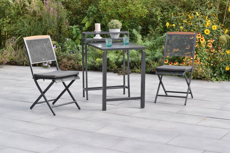 Ergänzt wird das Set durch einen modernen Balkonklappentisch, der vor allem durch seinen Graphitton überzeugt. Die Tischplatte lässt sich einfach abklappen und bietet so ein hohes Maß an Flexibilität. Ein Vorteil des Tisches ist auch, die Ablagefläche für Dekoration oder Getränke.