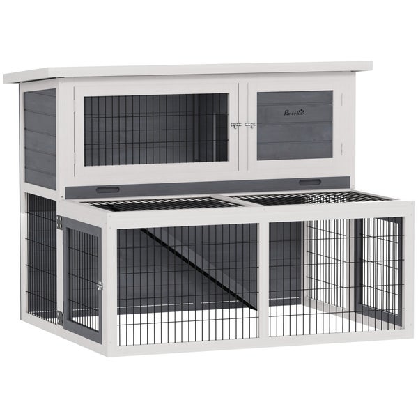 PawHut Hasenstall 2 Ebenen mit klappbar Dach Kaninchenstall aus Vollholz Winterfest Doppelstockhaus mit Freilaufgehege 122x95x93,5 cm Kaninchenkäfig Outdoor Kleintierstall für Hasen Kaninchen Grau