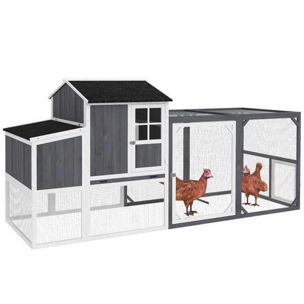 PawHut Hühnerstall, 236,5 x 91 x 114 cm Hühnergehege mit Nistkasten, Freigehege, Hühnerhaus aus Holz mit 2 Sitzstangen, wasserfester Anstrich, für 3-4 Hühner, Grau