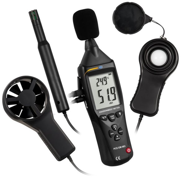 Das Umweltmessgerät ist ein 5 in 1 Multifunktionsmessgerät. Dieses Umweltmessgerät misst je nach Sensor und gewählter Messfunktion Lichtstärke, Schallpegel, Temperatur & Luftfeuchte sowie die Windgeschwindigkeit. Das Umweltmessgerät eignet sich besonders für einfache Messaufgaben, wie zum Beispiel in Schulen um die Umweltgrößen und deren Ursprung zu erklären. Das Umweltmessgerät kann aber auch für simple Messungen im Bereich der Arbeitssicherheit genutzt werden. So ist das Umweltmessgerät zum Beispiel verwendbar, um die Lichtstärke im Büro am Arbeitsplatz zu messen. Ebenso ist es möglich mit dem Umweltmessgerät die Schallemission von Maschinen und Anlagen zu bestimmen. Über das integrierte Flügelradanemometer ist es mit Hilfe vom Umweltmessgerät möglich, Lüftungs- und Klimaanlagen zu überprüfen.