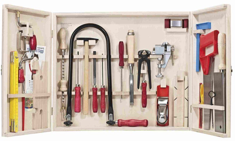 - Schraubendreher (Schlitz), Ringbohrer, Drillbohrer, Bohrwinde, Schraubstock, Schleifböckchen, Zollstock 1 m, Winkel, Pinsel, Holzleim, Anleitung verpackt im Karton