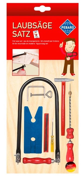 Inhalt: Laubsäge, Laubsägetischchen, Zwinge, Laubsägeblätter, Laubsägeschlüssel, Schraubendreher (Schlitz), Hammer, Drillbohrer, Anleitung
