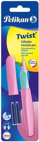 Der Pelikan Füller Twist ist das Trendschreibgerät für junge Leute aus dem Traditionshaus Pelikan. Durch seinen gedrehten Look und die trendigen Farbkombinationen ist der Füller ein echter Hingucker in jeder Federtasche. Die Twist Füllhalter und Roller bestechen durch ihr trendiges Design und ihre auffällige Zweifarbigkeit, wenn die Geräte geöffnet sind. Damit die Nutzer auch beim Schreiben strahlen können, greift der Twist die Farb-Trends aus dem Fashion- und Lifestylebereich auf. Ob fancy oder eher klassisch, den Pelikan Twist gibt es für jeden Geschmack garantiert in der passenden Farbkombination. Aufgrund ihrer einzigartig gedrehten Form und ihres ergonomischen Griffprofils liegen die Twist Schreibgeräte auch bei längerem Schreiben perfekt in der Hand und das bei Links- und Rechtshändern gleichermaßen. Dem Twist Füller liegt standardmäßig eine königsblaue Pelikan Tintenpatrone mit löschbarer Tinte bei. Diese Tinte lässt sich bei kleinen Schreibfehlern problemlos durch einen Tintenlöscher von Pelikan rückgängig machen. Alle Twist Trendschreibgeräte mit ihrem gedrehten Look und ihrer ergonomischen Form werden in Deutschland gefertigt. Qualität made in Germany Made by Pelikan. Der Twist Füller Deep Blue kommt in einem passenden Blister mit zwei königsblauen Tintenpatronen inklusive.