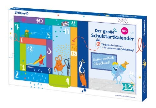 Der Kalender für den Schulstart. Der große Countdown zum Schulbeginn! 15 Faltschachteln mit Schulanfangsprodukten, um die aufregende Zeit bis zum Schulstart zu verkürzen.Eine tolle Überraschung für alle Erst- oder Zweitklässler. Mit vielen kindersicheren Pelikan Markenprodukten für die Schule oder Zuhause.