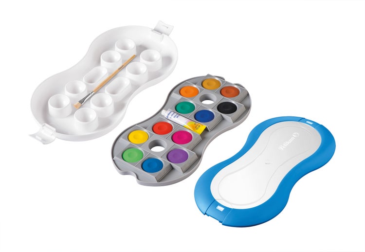 12 Qualitätsfarben für brillantes Malen. Trendiges Design mit 10 extra großen Mischfeldern. Leicht zu reinigende Mischpalette. Leicht auswechselbare Farbschälchen. Farbpalette platzsparend im Deckel einsetzbar. Stabiles Material - ideal für Kinder. Made in Germany.