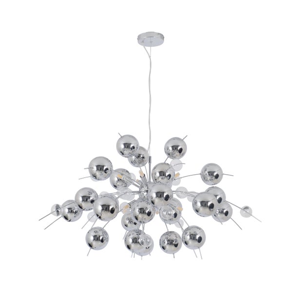 Die EXPLOSION Pendelleuchte aus unserer Kollektion ist ein echter Hingucker für jeden Wohnraum. Mit Pendelleuchten erhalten Sie eine direkte und zielgerichtete Beleuchtung, die optimal für die Beleuchtung von Esstischen, Kücheninseln, Arbeitsbereichen oder anderen Bereichen geeignet ist, die eine konzentrierte Lichtquelle benötigen. Sie akzentuieren bestimmte Zonen und schaffen eine klare Lichtquelle für alltägliche Aufgaben. Eine extravagant Optik und die kugelförmige Gestalt machen diese Lampe im Modern Style zu einem unverzichtbaren Element für alle, die eine harmonische Einrichtung schätzen. Die Leuchte in chrome ist aus Metall und Glas gefertigt und ist ein echter Blickfang in jedem Raum. Das verchromte Gestell und der klar-transparente Schirm bilden eine vollkommene Einheit. Die Pendelleuchte misst 98 cm in der Länge, 98 cm in der Breite/Tiefe und 187 cm in der Höhe. Somit hat die Leuchte einen Durchmesser von 98 cm. Die Länge des Pendels kann individuell angepasst werden und liegt zwischen 55 und 187 cm. Die Zuleitung hat eine Länge von 150 cm und ist klar/transparent. Diese Pendelleuchte ist die ideale Lösung für die unterschiedlichsten Beleuchtungsanforderungen. Dank der G9 Fassung steht Ihne eine große Auswahl an Leuchtmitteln zur Verfügung. 10 der Fassungen sorgen für genügend Licht. Mit der Option, das Leuchtmittel selbst auszutauschen, sind Sie nicht nur flexibel, sondern schonen auch Ihren Geldbeutel. Diese Leuchte entspricht der Klasse 2. Dieses Gerät ist für den Betrieb am Stromnetz ausgelegt und funktioniert mit einer Netzspannung von 220-240V ~ 50Hz. Eine Gesamtleistung von 280 Watt sorgt für ein helles und energieeffizientes Leuchten im Wohnbereich. Unsere qualitativ hochwertigen Pendelleuchten sorgen für das optimale Lichtambiente und verleihen Ihrem Zuhause Komfort und Stil in jedem Raum.